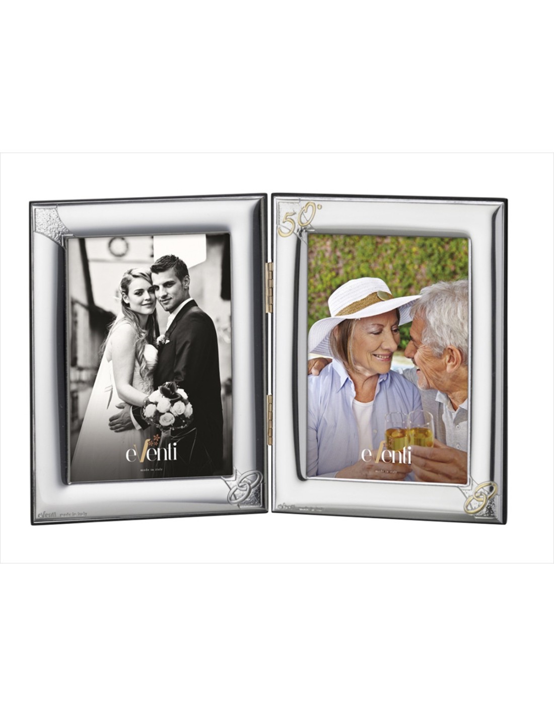 Se trata de un portafotos doble para conmemorar el 50 aniversario de boda. Bisagra en el centro y se puede poner de pie. Está fabricado en un bilaminado de plata de ley 925. Tiene capacidad para dos fotos de 13 x 18 cm. Trasera de madera. Referencia EV9108/04C. Somos distribuidores oficiales de la marca Eventi. Se entrega con su caja oficial.