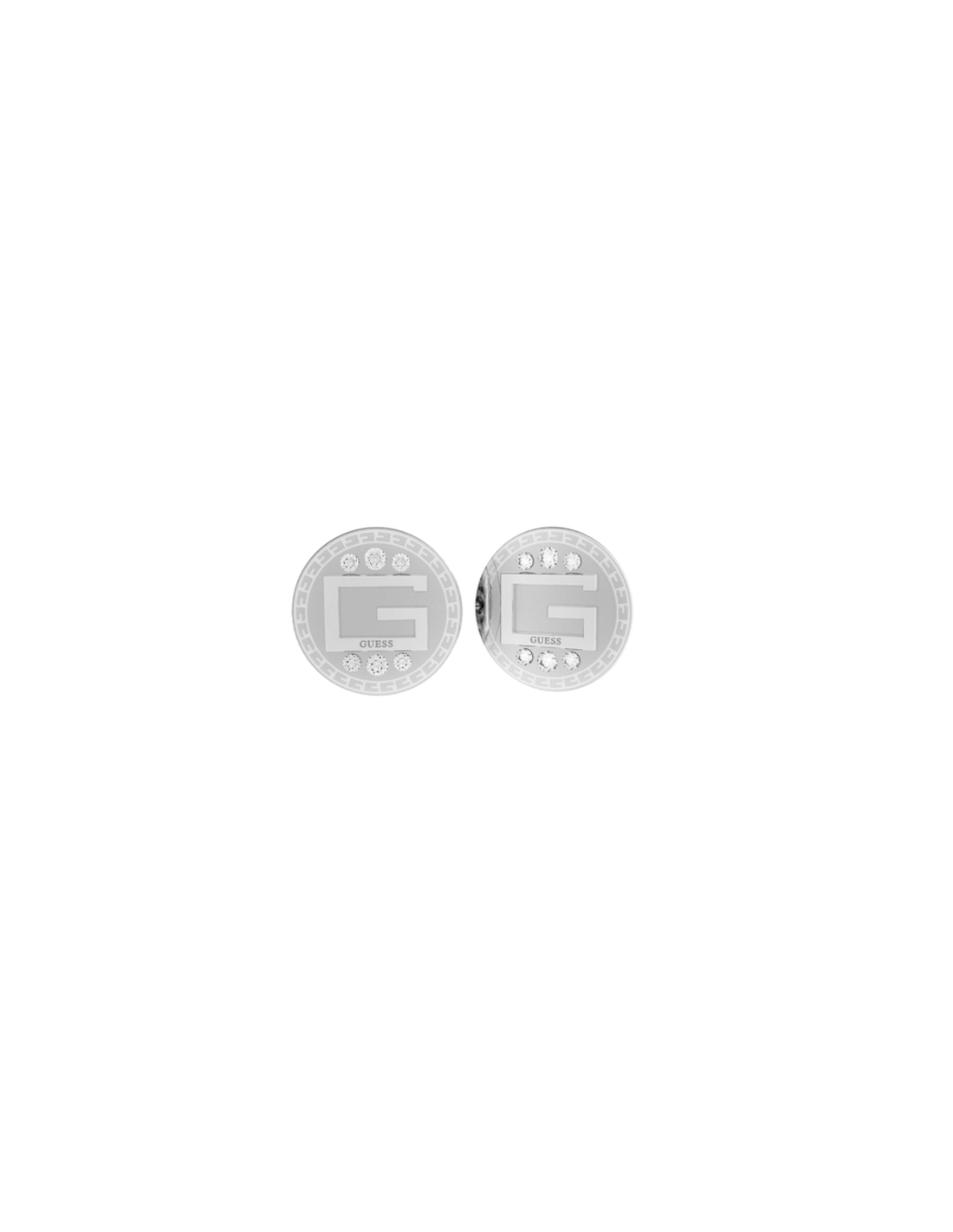 Pendientes para mujer fabricados en acero inoxidable marca Guess. Son unos pendientes de acero color plateado con logo de Guess y circonitas referencia JUBE01028JWRHT-U. Tienen un diámetro de 13mm y cierre tipo tuerca a presión. Se incluye estuche y garantía oficial Guess.