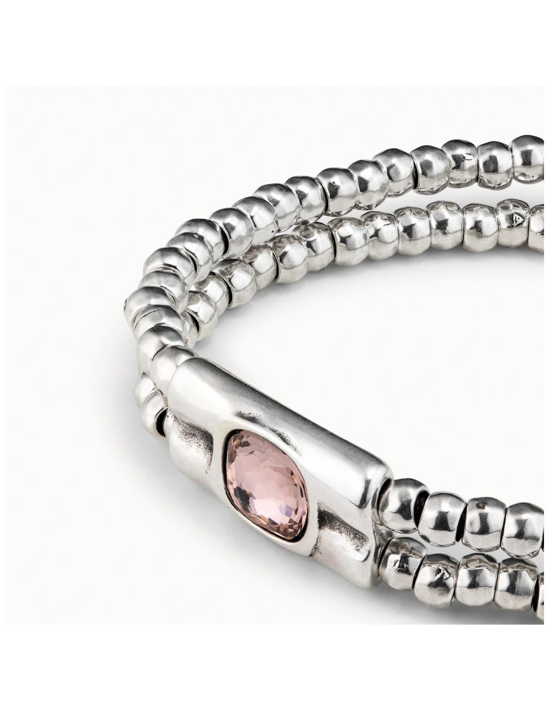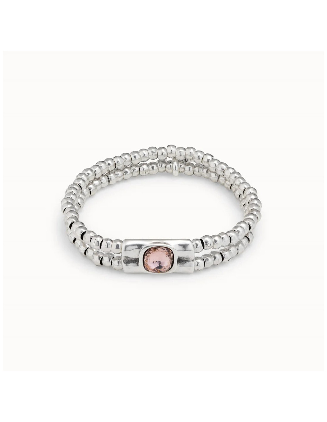Pulsera elaborada en metal bañado en plata con cristal rosa marca UNO de 50 ref. PUL2133SALMTL. Talla M. Pulsera elástica. Colección Fearless. Está elaborada en España utilizando técnicas artesanales, con una aleación de metales y cuero. Se incluye bolsa y certificado oficial de la marca.