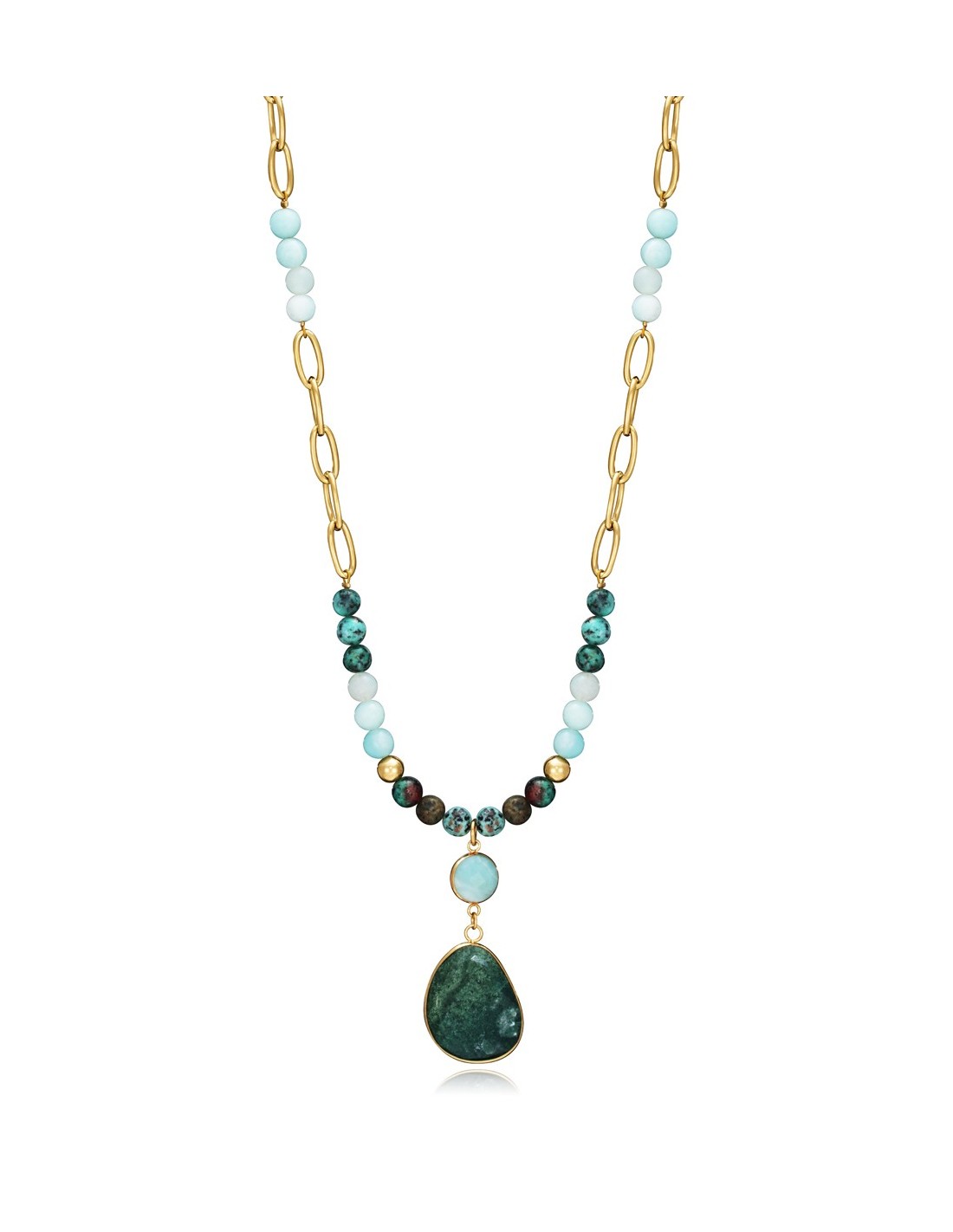 Collar fabricado en acero inoxidable color dorado con amazonita, turquesa y ágata. Largo 60+3 cm.