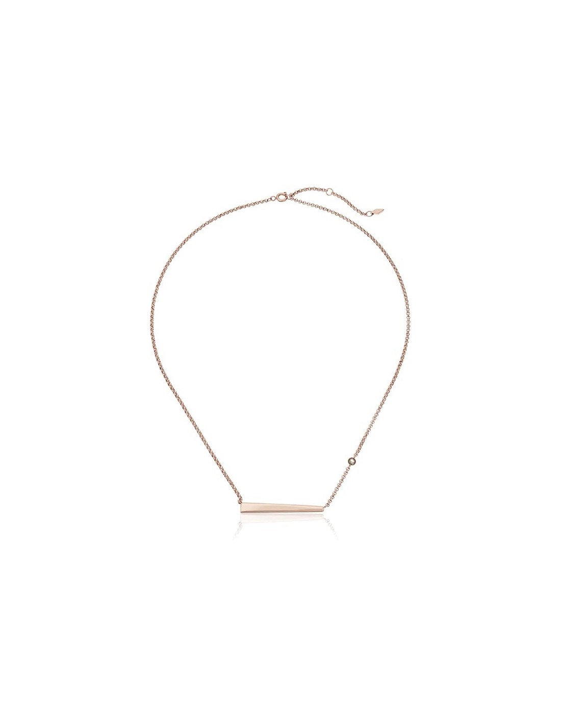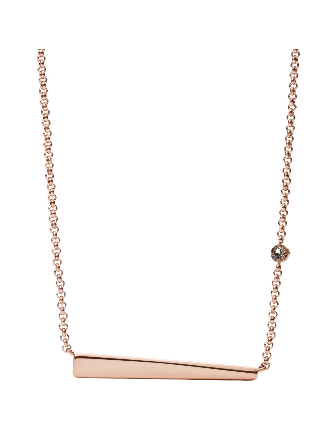 Collar para mujer fabricado en acero inoxidable marca Fossil. Se trata de un collar de acero color rosado referencia JF02309791. Colgante de placa con una circonita blanca en la cadena. Dispone de una cadena extensible para ajustar el tamaño de 45 a 50 centímetros con cierre de mosquetón. Se incluye estuche y garantía oficial Fossil.