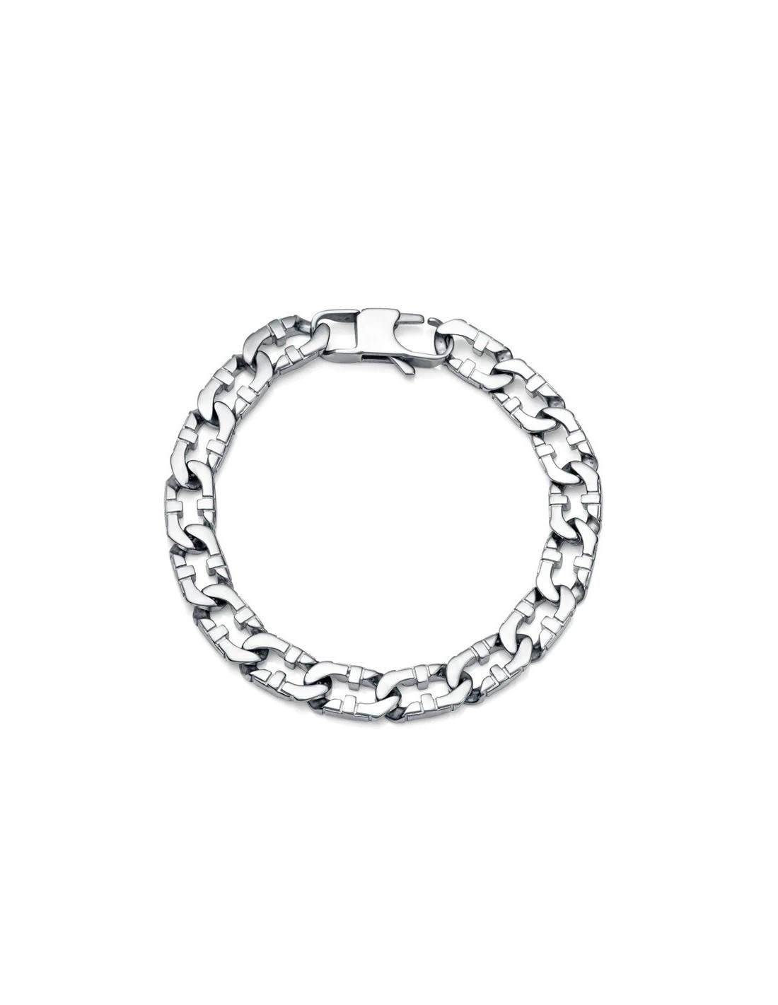 Pulsera fabricada en acero inoxidable con eslabones. Largo 21,5 cm ajustable.