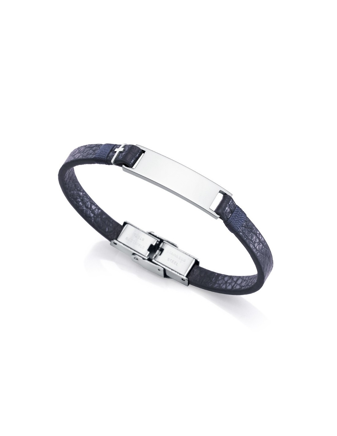 Pulsera fabricada en acero y piel color azul marino con motivo de cruz. Ideal para comunión.
