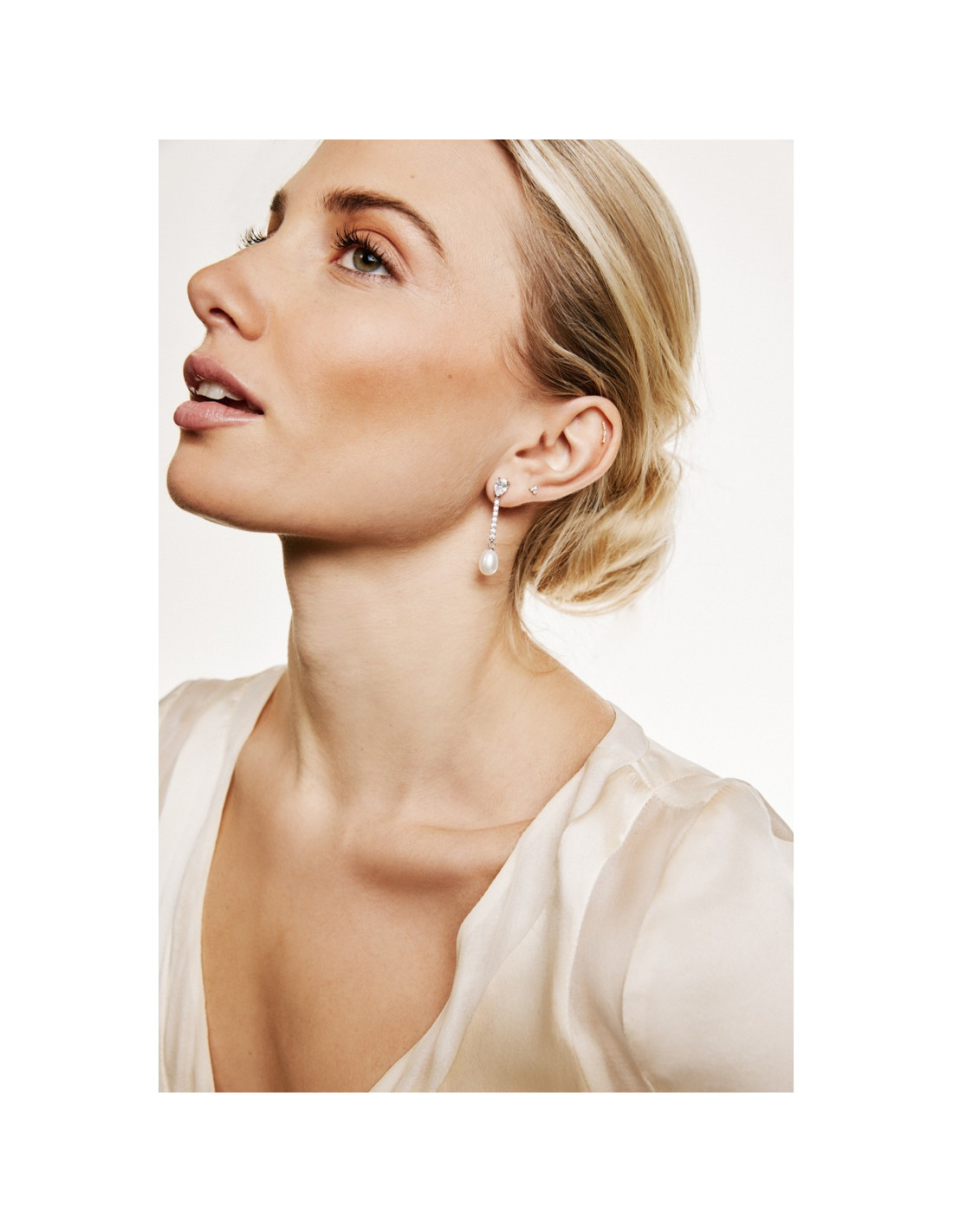 Pendientes de mujer fabricados en plata 925 con barra de circonitas y perla cultivada. Ideales para novia.