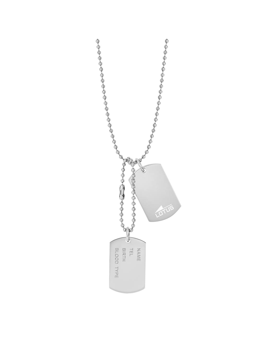 Colgante marca Lotus Style fabricado en acero con cadena y dos chapas militares ref. LS2139-1/1 colección Urban Man. La cadena tiene un largo de 55cm y cada chapa mide 3,5 x 2cm. Se incluye estuche oficial Lotus Style.