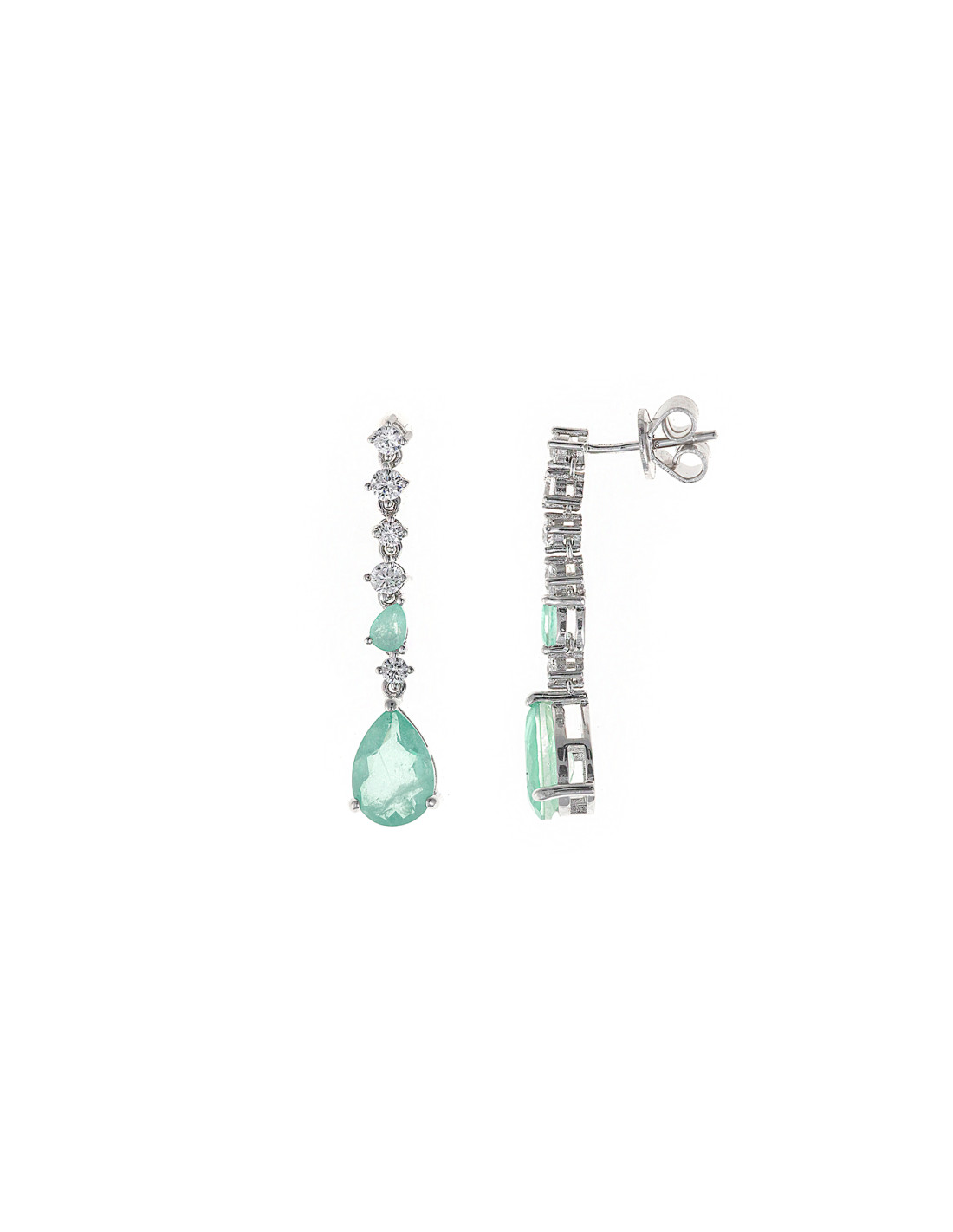 Pendientes de mujer de plata marca Salvatore Plata. Fabricados en plata de ley 925 rodiada con circonitas blancas y cristal color verde menta hielo. Tienen un largo total de 34 mm con cierre tipo palillo tuerca a presión. Referencia 112A0304. Se incluye estuche oficial Salvatore.