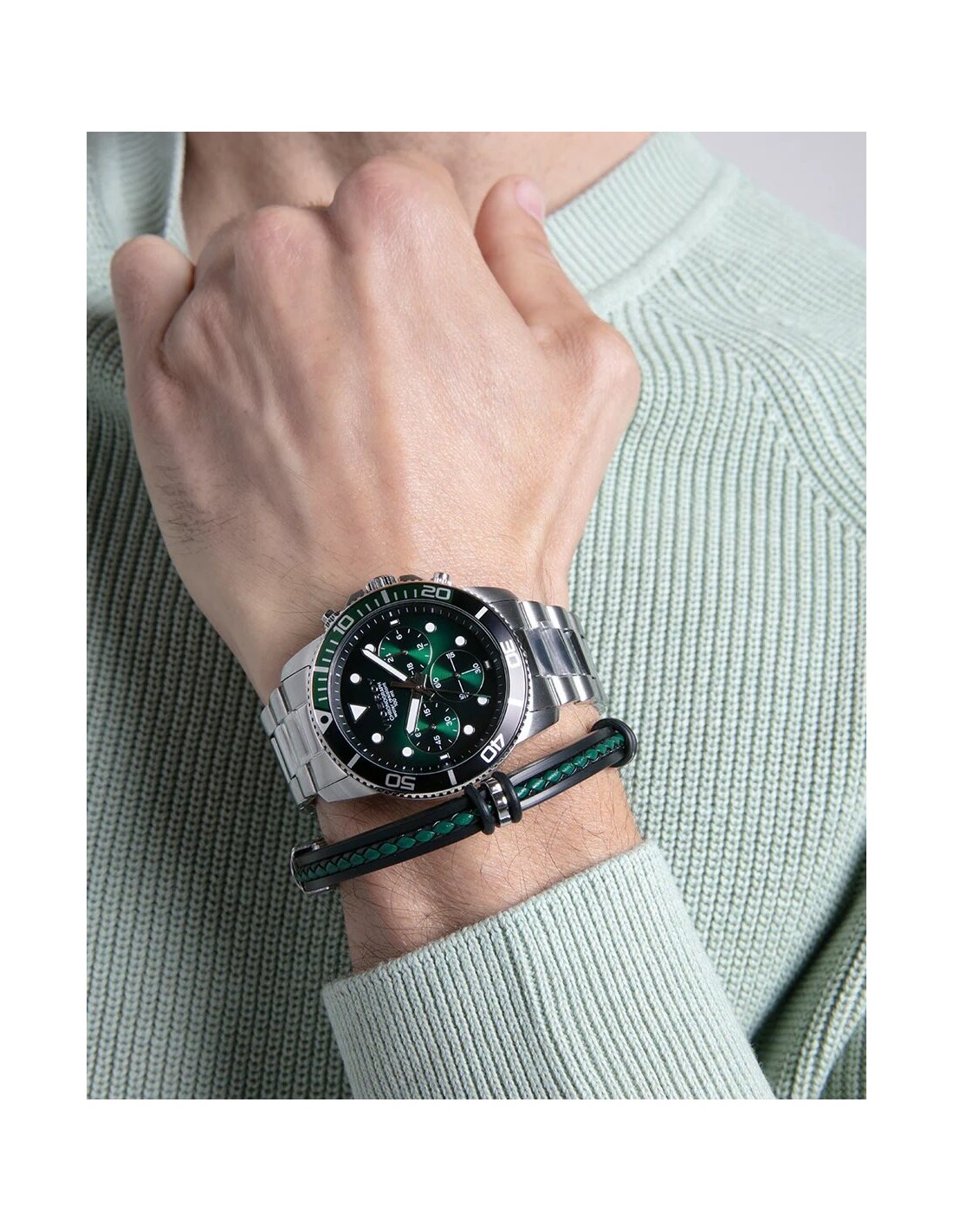 Pulsera fabricada en acero inoxidable con piel negra y verde.