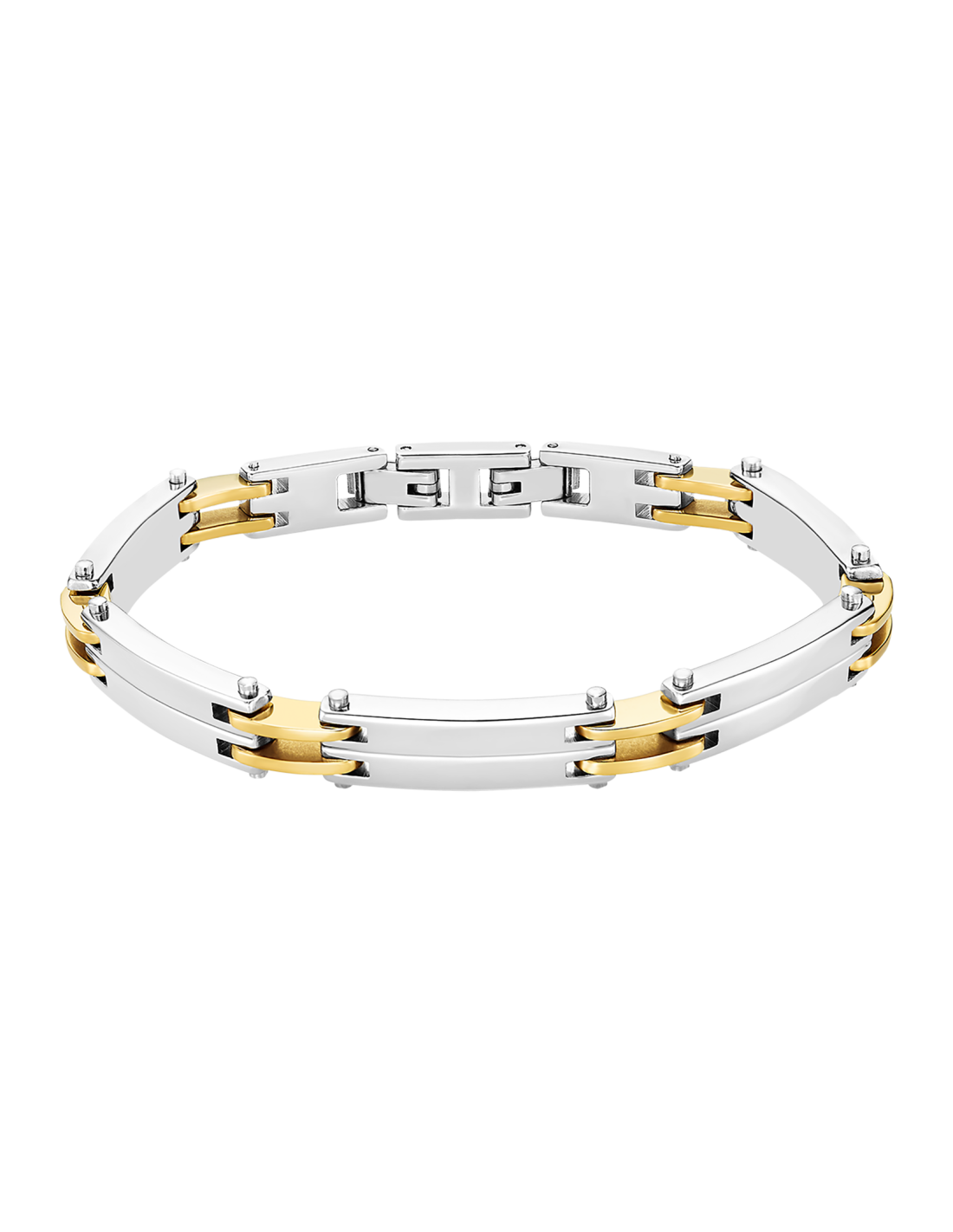 Pulsera fabricada en acero inoxidable con eslabones bicolor plateado y dorado. Colección Men in Black.