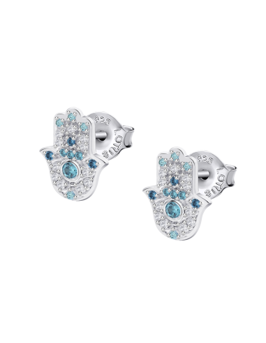 Pendientes de mujer fabricados en plata 925 marca Lotus Silver. Son unos pendientes con forma de Mano de Fátima con circonitas blancas y azules. Tamaño 13mm. Cierre tipo tuerca a presión. Colección Rainbow. Se incluye estuche y certificado oficial Lotus Silver.