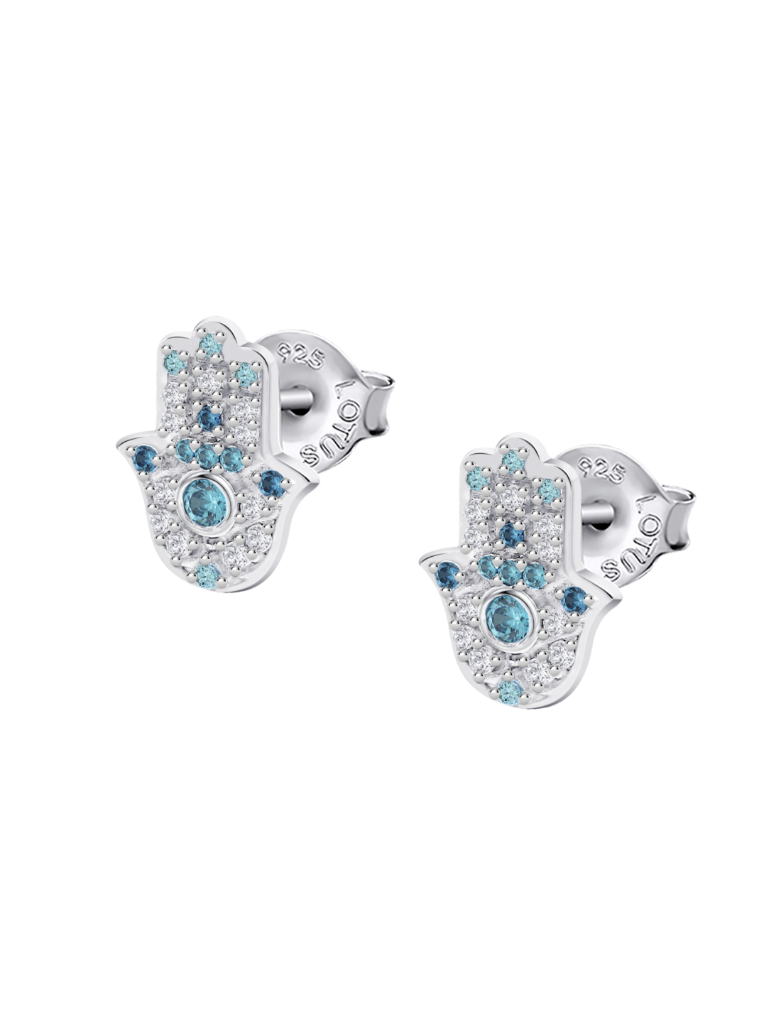 Pendientes de mujer con forma de Mano de Fátima con circonitas blancas y azules colección Rainbow. Fabricados en plata 925.