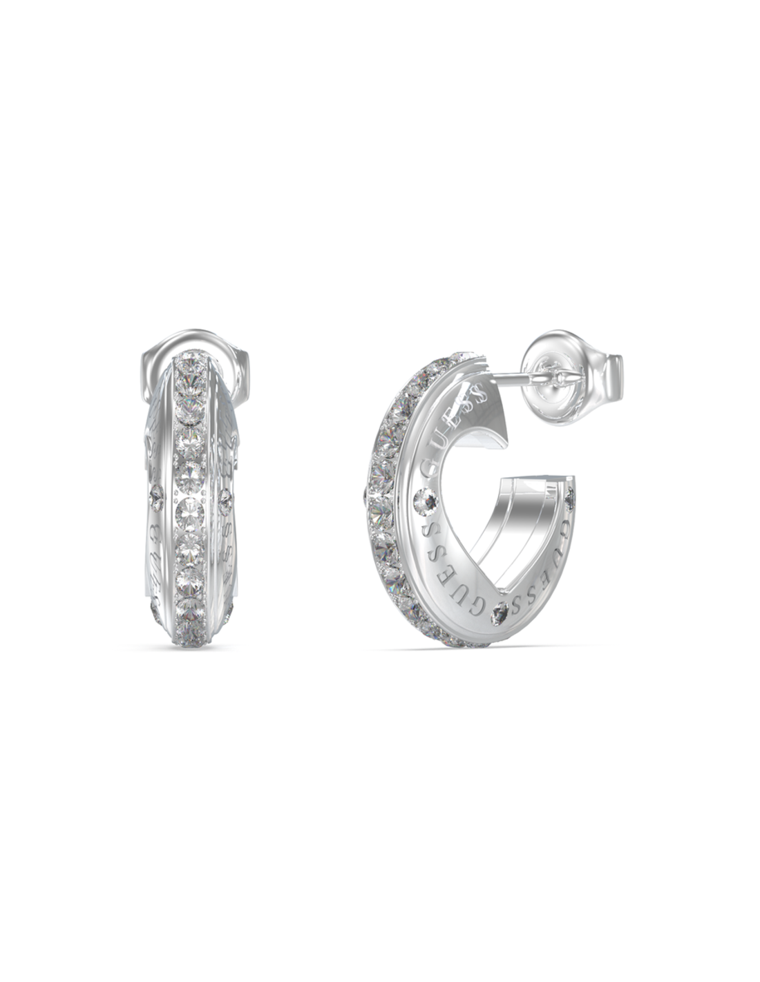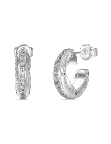 Pendientes para mujer fabricados en acero inoxidable marca Guess. Son unos pendientes de acero tipo aros color plateado con circonitas blancas referencia JUBE03347JWRHT-U. Tienen un diámetro de 16mm y cierre tipo tuerca a presión. Se incluye estuche y garantía oficial Guess.
