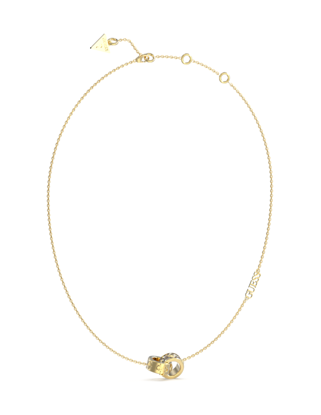 Collar para mujer fabricado en acero inoxidable marca Guess. Se trata de un collar de acero color dorado referencia JUBN03281JWYGT-U. Colgante de dos aros enlazados con circonitas. Dispone de una cadena extensible para ajustar el tamaño de 40 a 48 centímetros con cierre de mosquetón. Se incluye estuche y garantía oficial Guess.