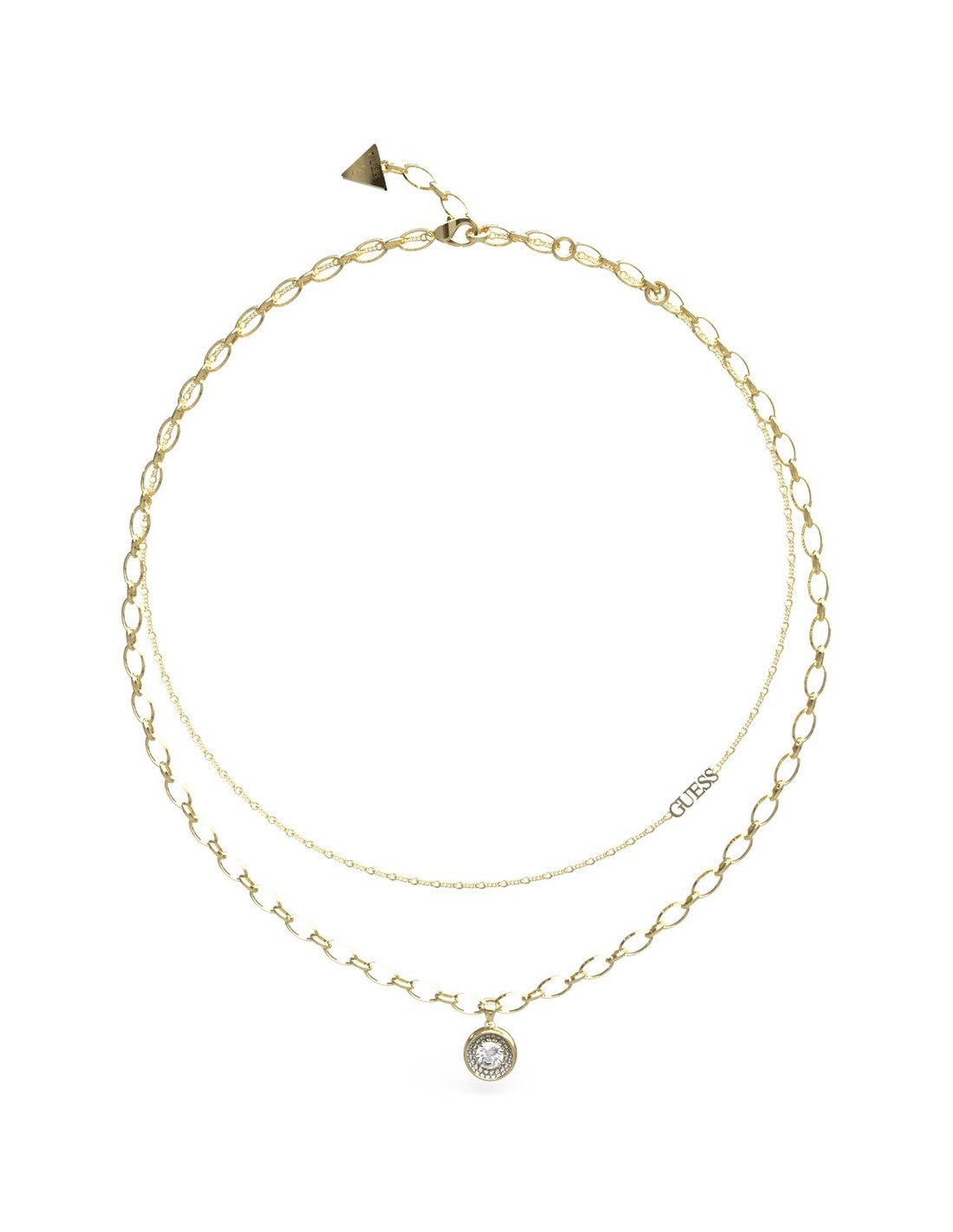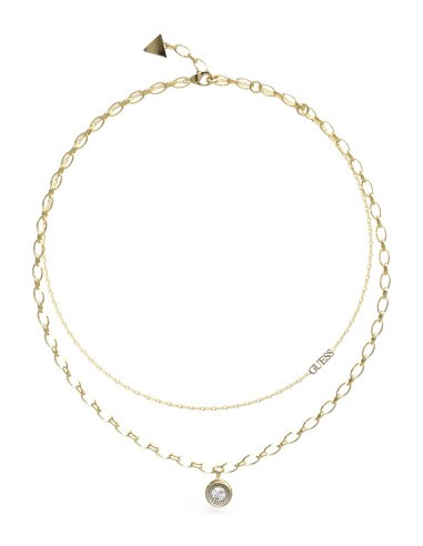 Collar para mujer fabricado en acero inoxidable marca Guess. Se trata de un collar doble de acero color dorado referencia JUBN03395JWYGT-U. Colgante redondo con cristal. Largo cadena collar corto de 36 a 41 centímetros con cierre de mosquetón. Se incluye estuche y garantía oficial Guess.
