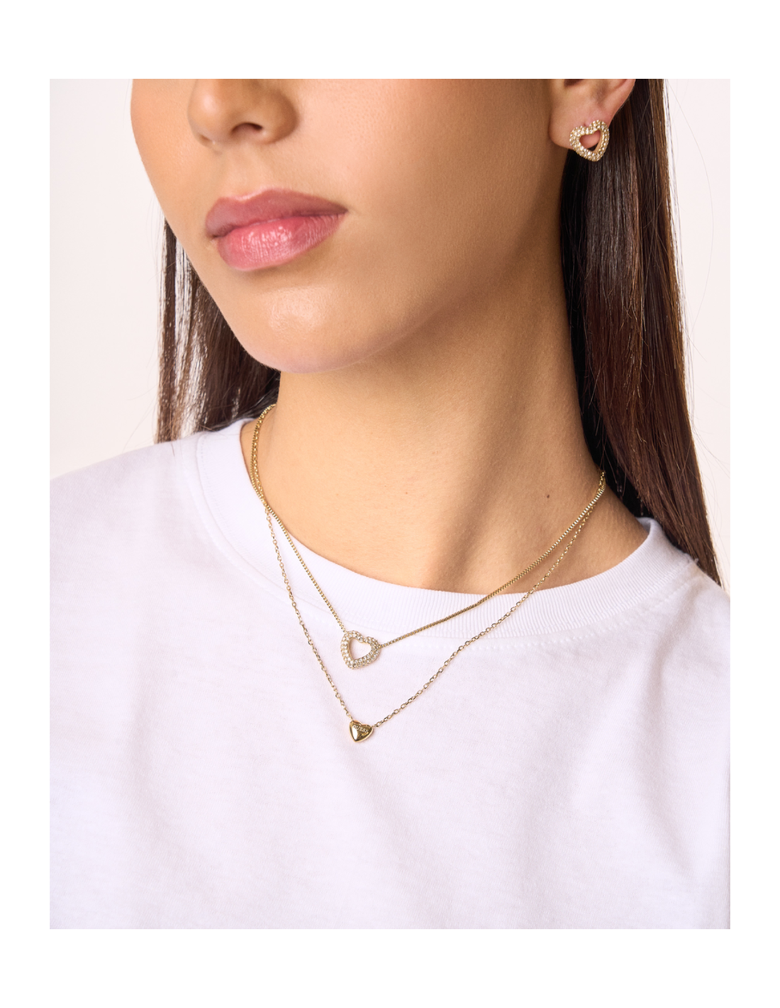 Set de pendientes y collar para mujer fabricado en acero inoxidable color dorado con forma de corazón.