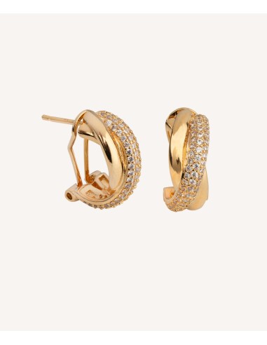 Pendientes de mujer con tiras enlazadas y circonitas. Fabricados en metal chapado en oro 18kt.