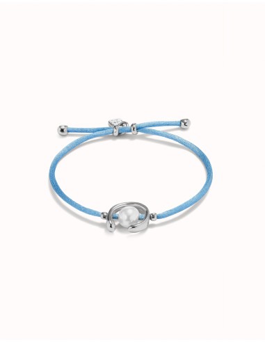 Pulsera SER DIFERENTE de mujer elaborada en metal bañado en plata con hilo azul y perla marca UNO de 50 ref. PUL2505AZUMTL0M. Colección Ser Diferente. Talla M. Está elaborada en España utilizando técnicas artesanales, con una aleación de metales y cuero.