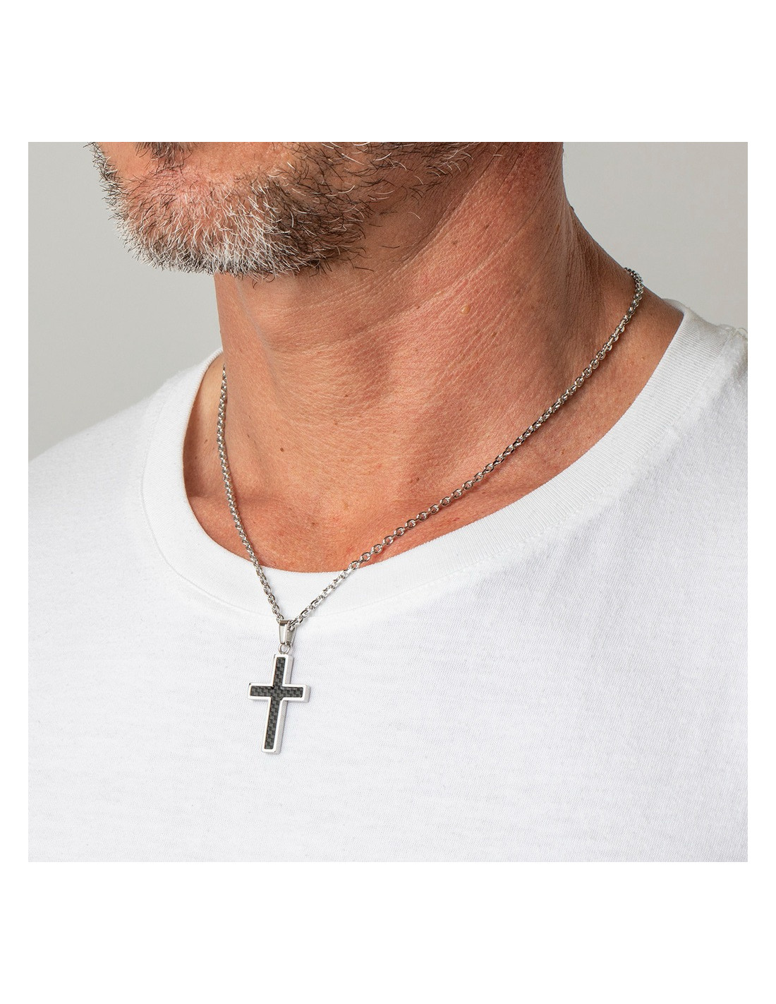 Collar fabricado en acero inoxidable con colgante de cruz color negro. Colección Men in Black.