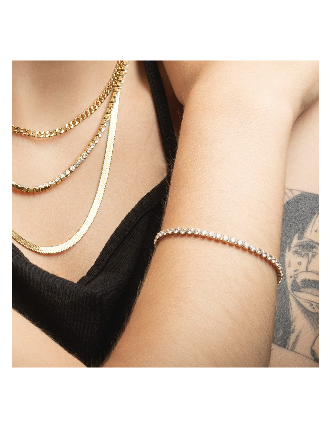 Pulsera fabricada en acero inoxidable color dorado tipo rivière con circonitas blancas.