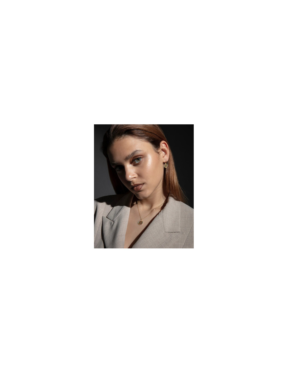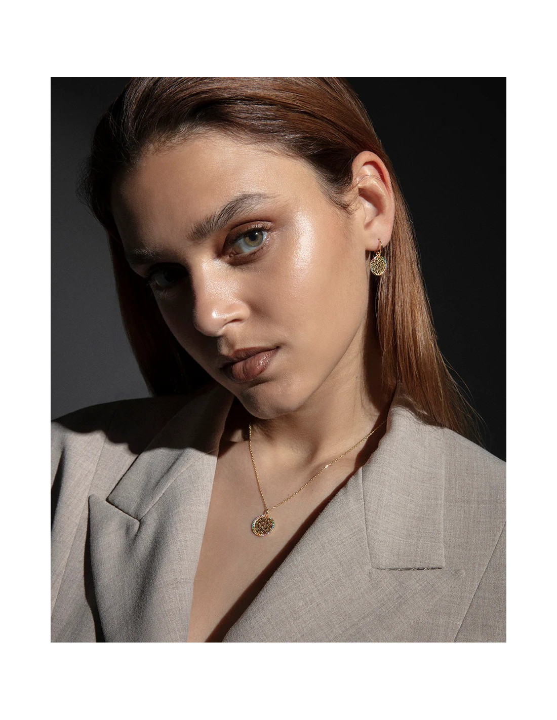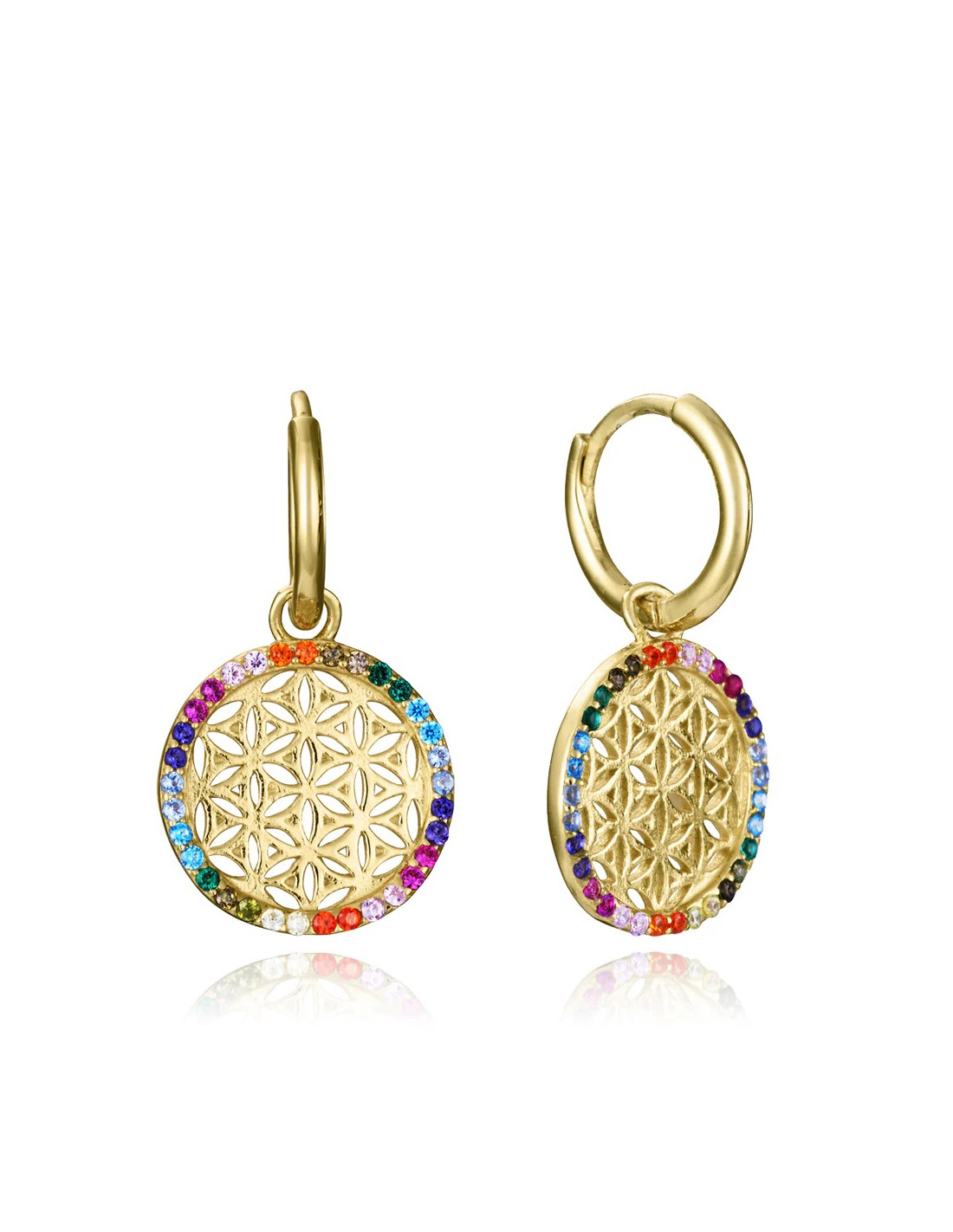 Pendientes fabricados en plata de ley bañados en oro. Aros con colgante redondo con circonitas de color.