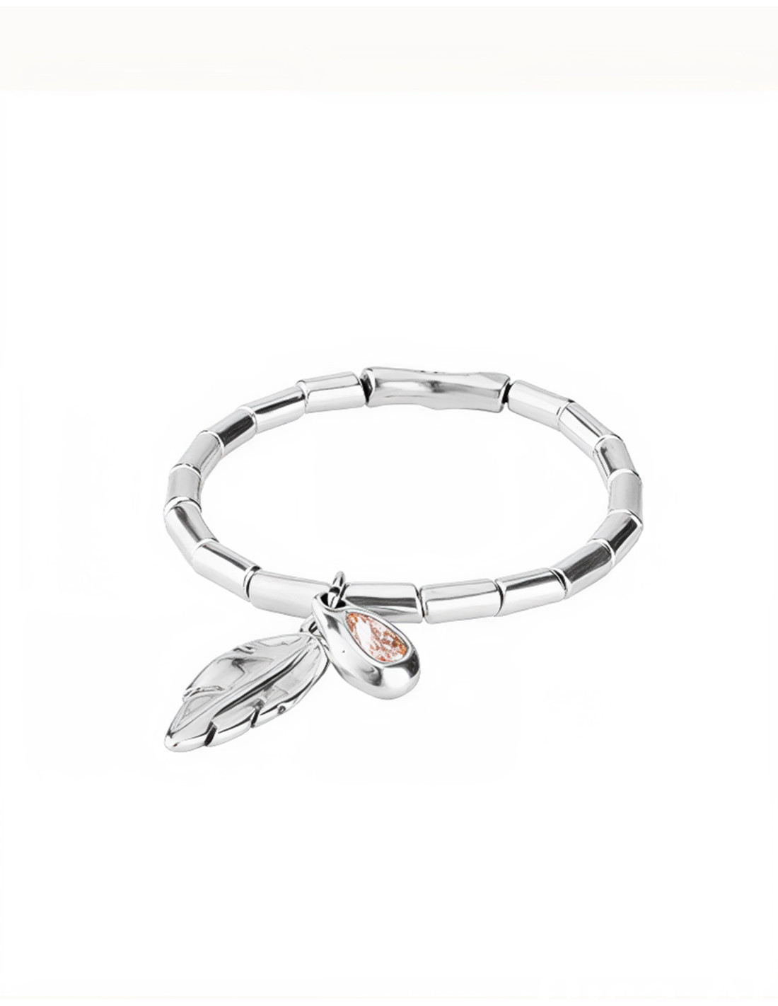 Pulsera elaborada en metal bañado en plata marca UNO de 50 ref. PUL1775RSAMTL. Talla M. Pulsera elástica. Con pluma y cristal de Swarovski color nude. Está elaborada en España utilizando técnicas artesanales, con una aleación de metales y cuero. Se incluye bolsa y certificado oficial de la marca.