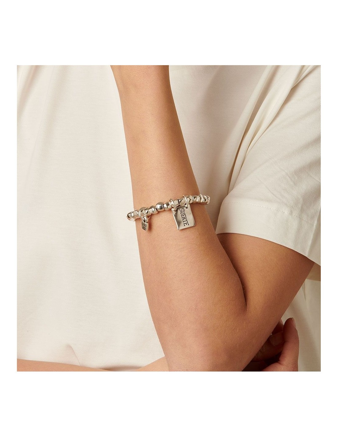 Pulsera de mujer fabricada con una aleación de metales bañados en plata con chapa de Suerte.