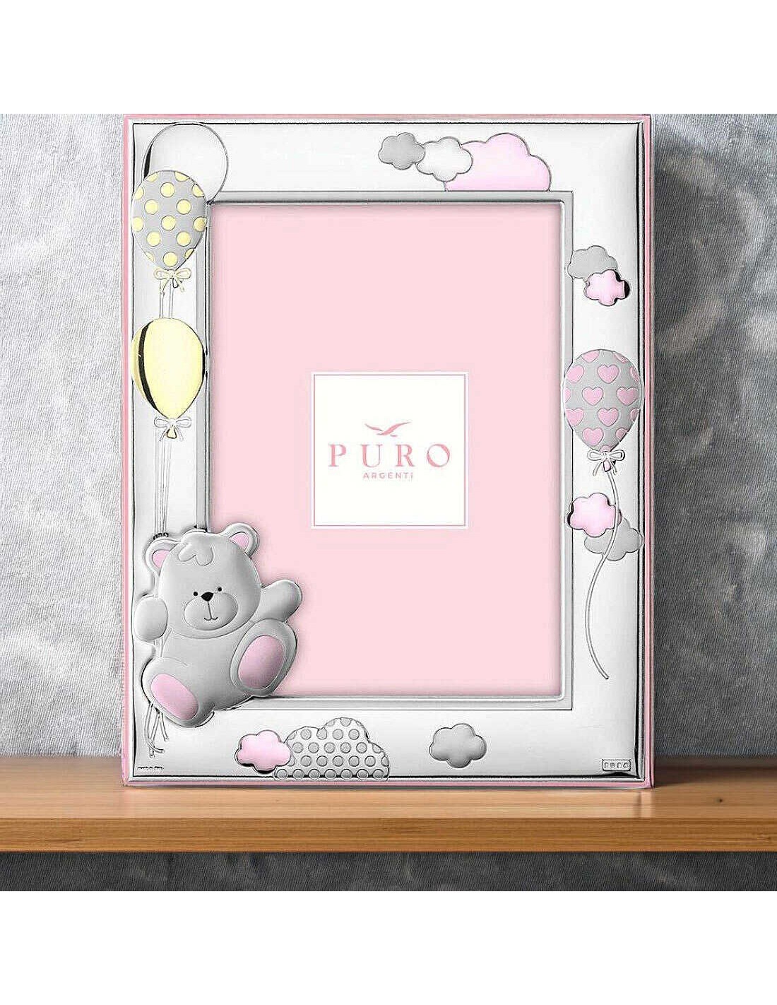 Marco infantil bilaminado en plata. Oficial de marca Puro Argenti con detalle de osito color rosa y con la trasera lacada en color rosa. Medida de la foto 13x18cm. Referencia PU8551/13R. Somos distribuidores oficiales de la marca Puro Argenti. El portafotos se entrega con estuche oficial.