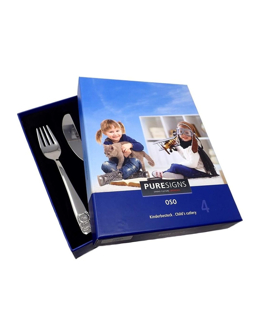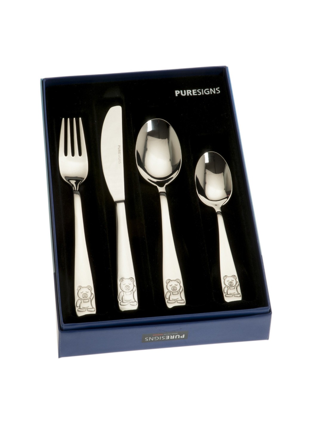 Set de cubiertos de 4 piezas para niño fabricados en acero inoxidable. Marca Puresigns. Tamaño 17cm de largo. Referencia LU6115. Contiene tenedor, cuchillo, cuchara sopera y cuchara de postre. Se incluye estuche oficial de la marca.