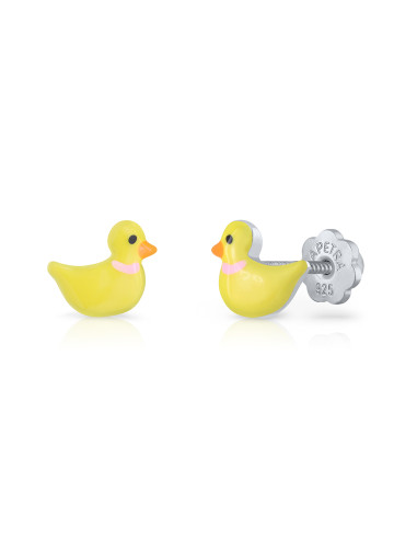 Pendientes de niña motivo de patito amarillo elaborados en Plata de Ley 925.