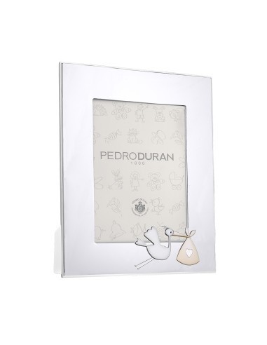 Portafotos plateado marca Pedro Durán referencia 07500900. Colección cigüeña con tamaño de foto 10x15cm. Trasera de madera lacada en blanco. Se incluye estuche oficial Pedro Durán.