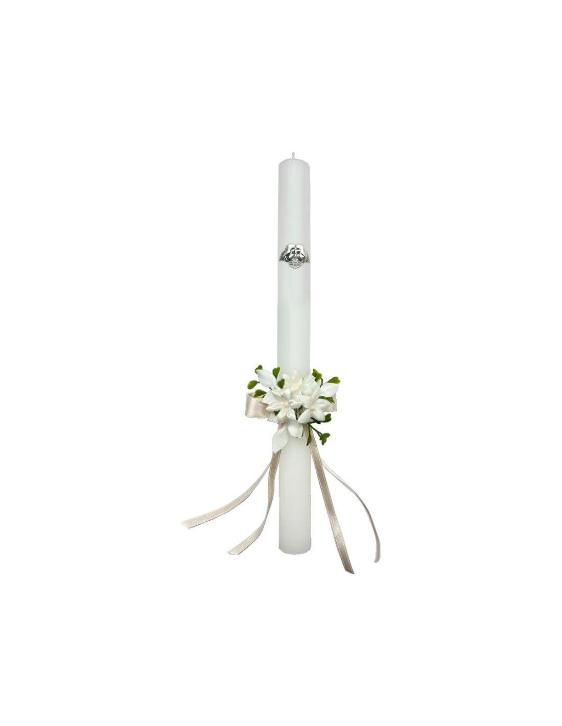 Estuche de bautizo con concha de nácar, vela con lazo y pañuelo bordado de lino. Referencia 09669-N.