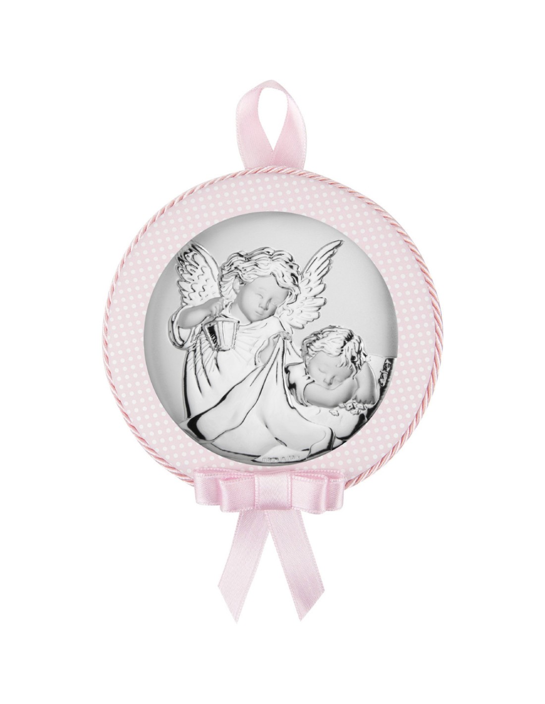 Medalla de cuna con motivo de Ángel de la Guarda y detalle de lazo rosa.