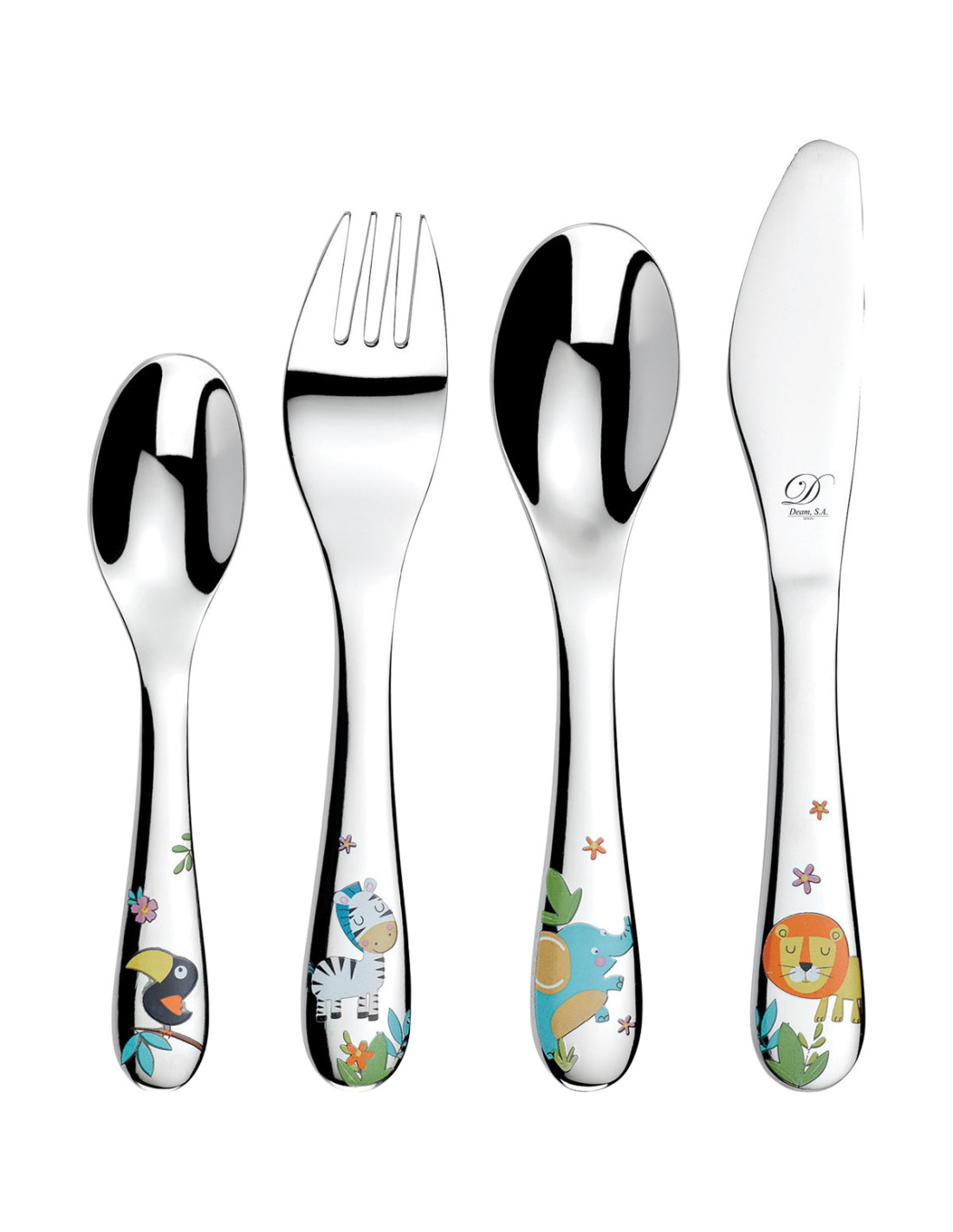 Set de cubiertos de 4 piezas para niño fabricados en acero inoxidable. Marca Deam SA.