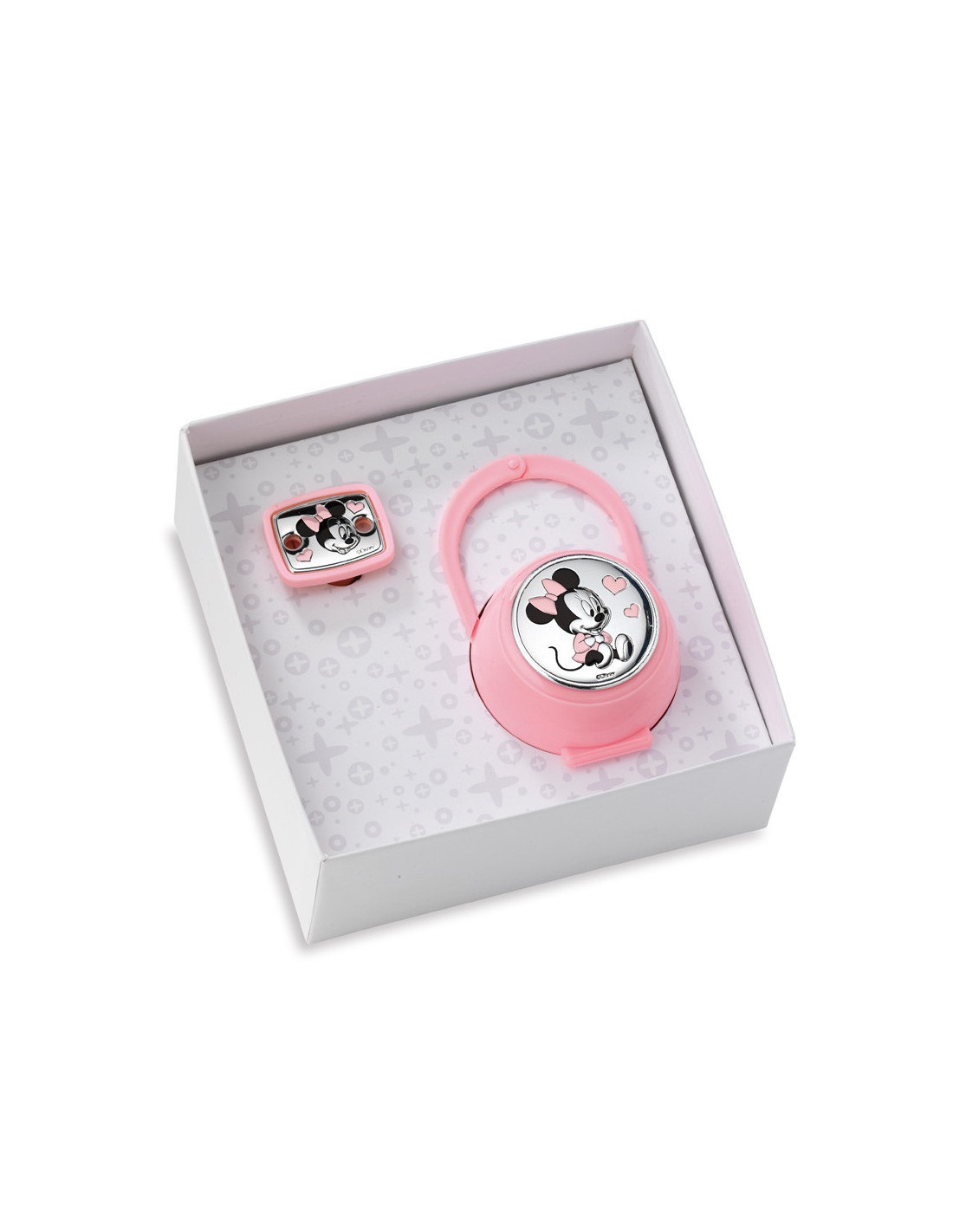 Conjunto de pinza para el chupete con porta chupete marca Global Argenti colección Disney con detalles de Minnie Mouse color rosa.