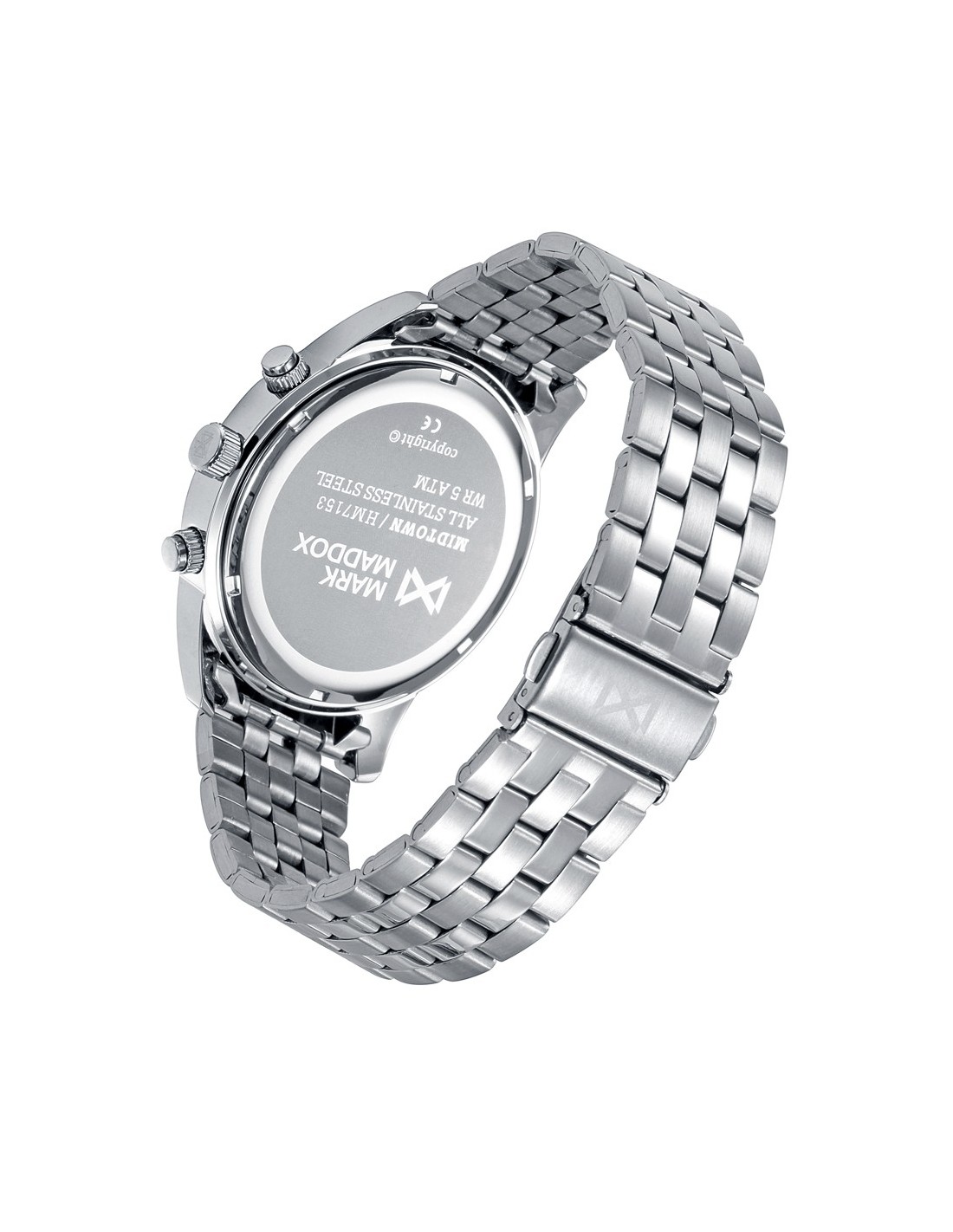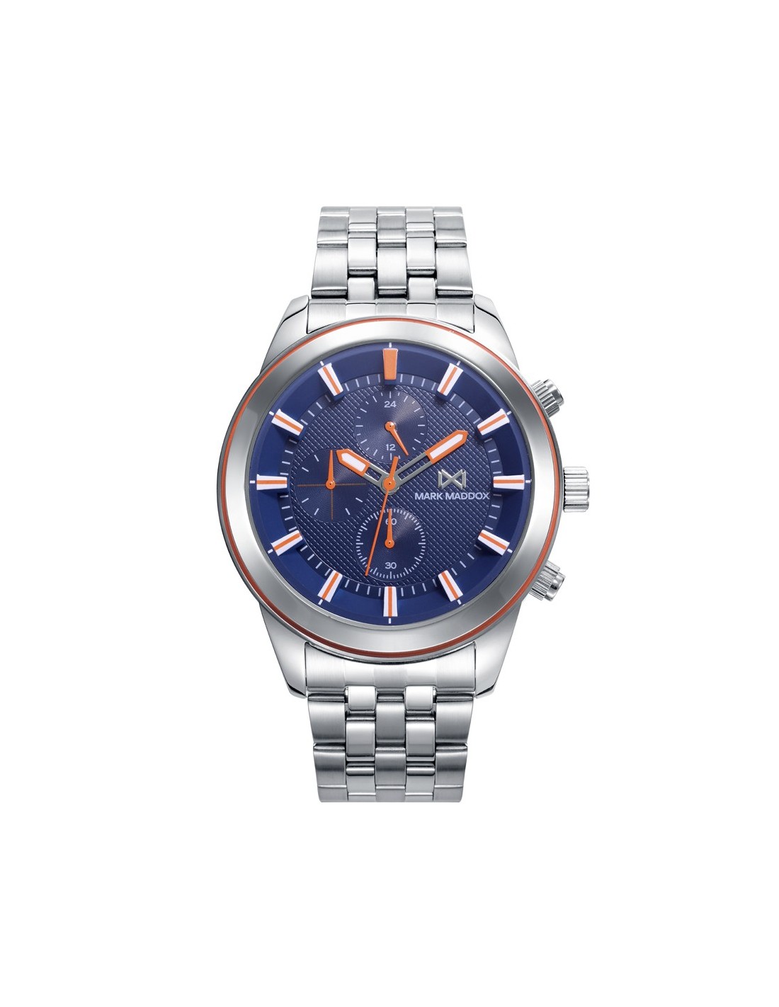 Se trata de un reloj analógico con caja redonda de acero inoxidable. La caja del reloj tiene un diámetro de 45mm. Cristal mineral y movimiento de cuarzo. Pulsera de acero con cierre tipo broche. Tiene una resistencia al agua de 50 metros (5ATM). Cuenta con la garantía oficial Mark Maddox de 24 meses. Se entrega con su caja oficial.