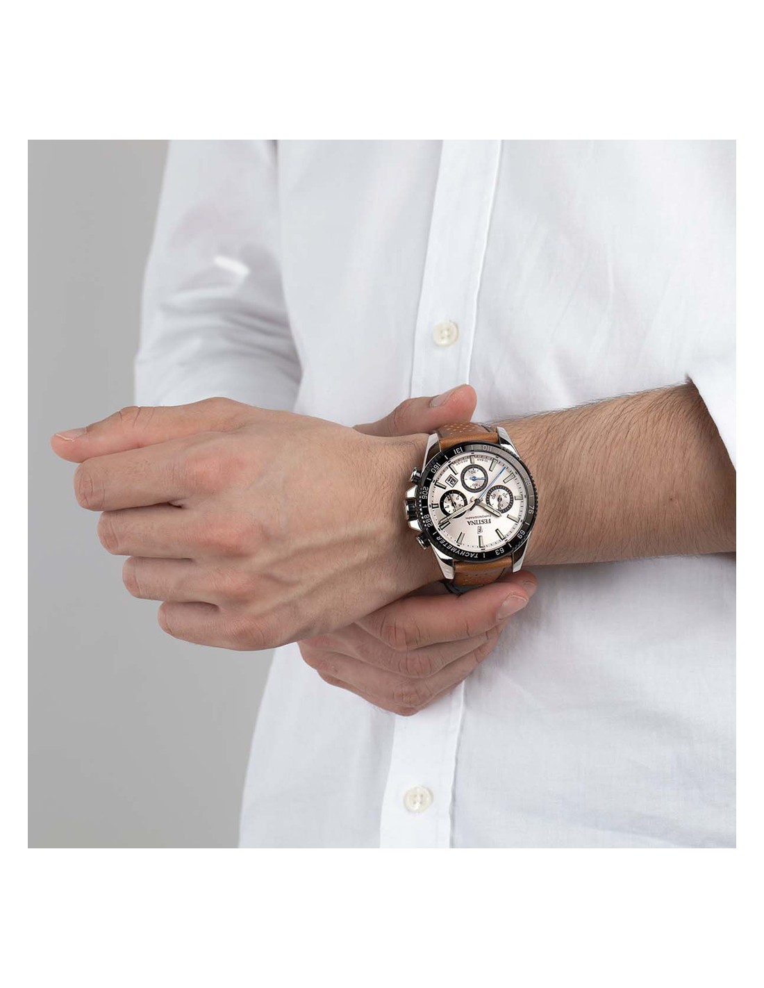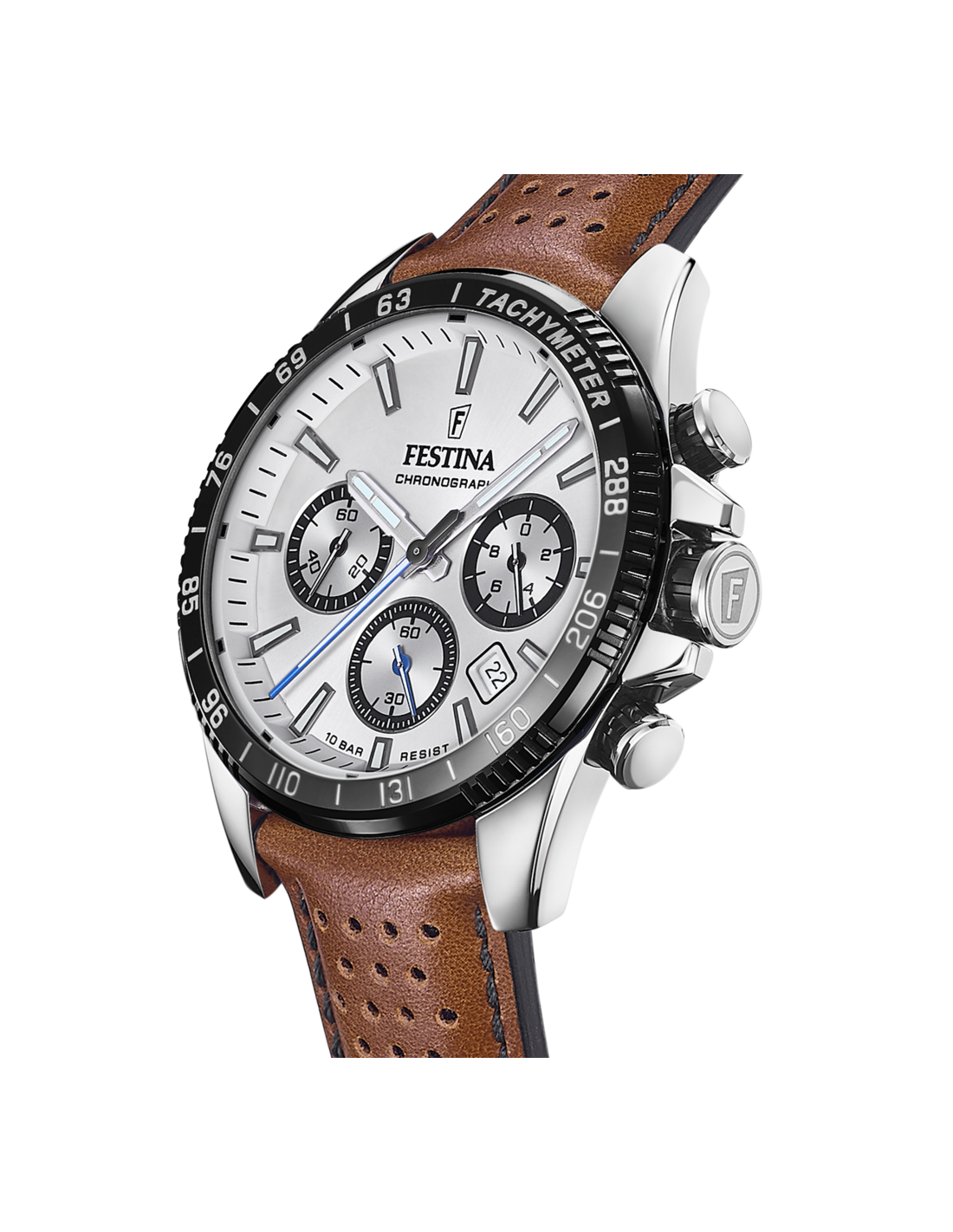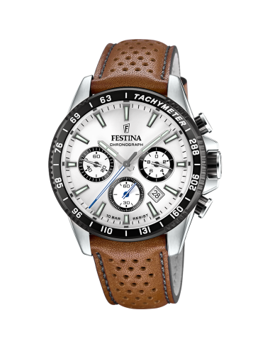 La caja del reloj tiene un diámetro de 45 mm aproximadamente. Esfera blanca con bisel negro. Cristal mineral y movimiento de cuarzo. Correa de piel marrón con cierre de hebilla. Tiene una resistencia al agua de 100 metros (10ATM). Cuenta con la garantía oficial Festina de 24 meses. Se entrega con su caja oficial.