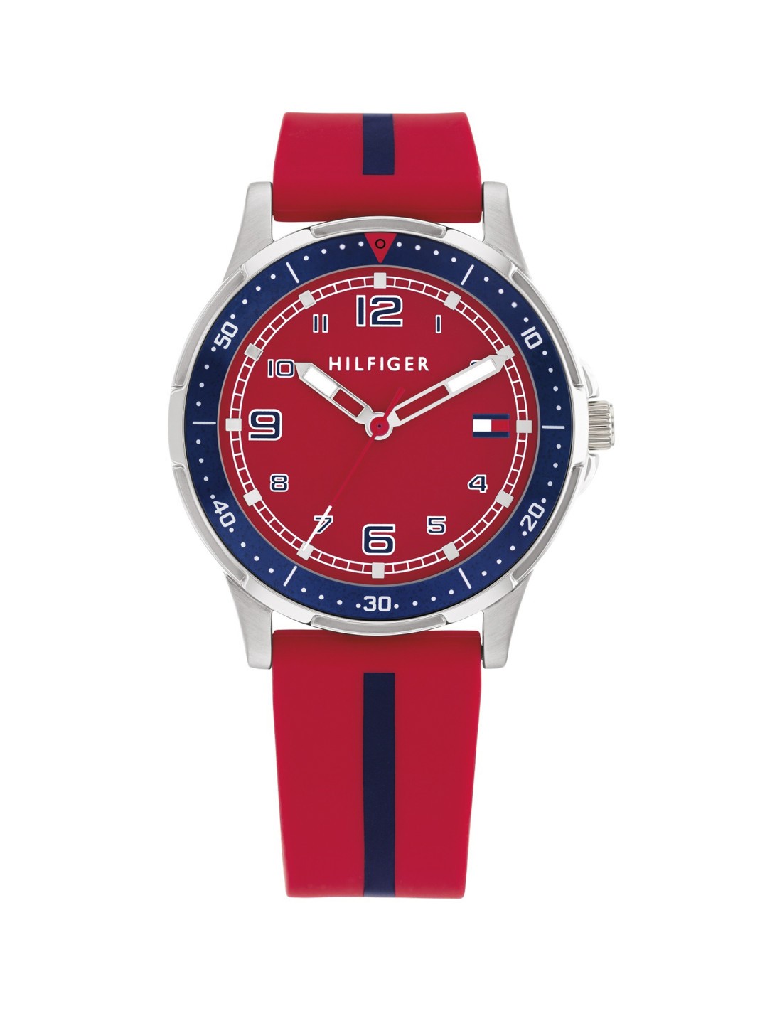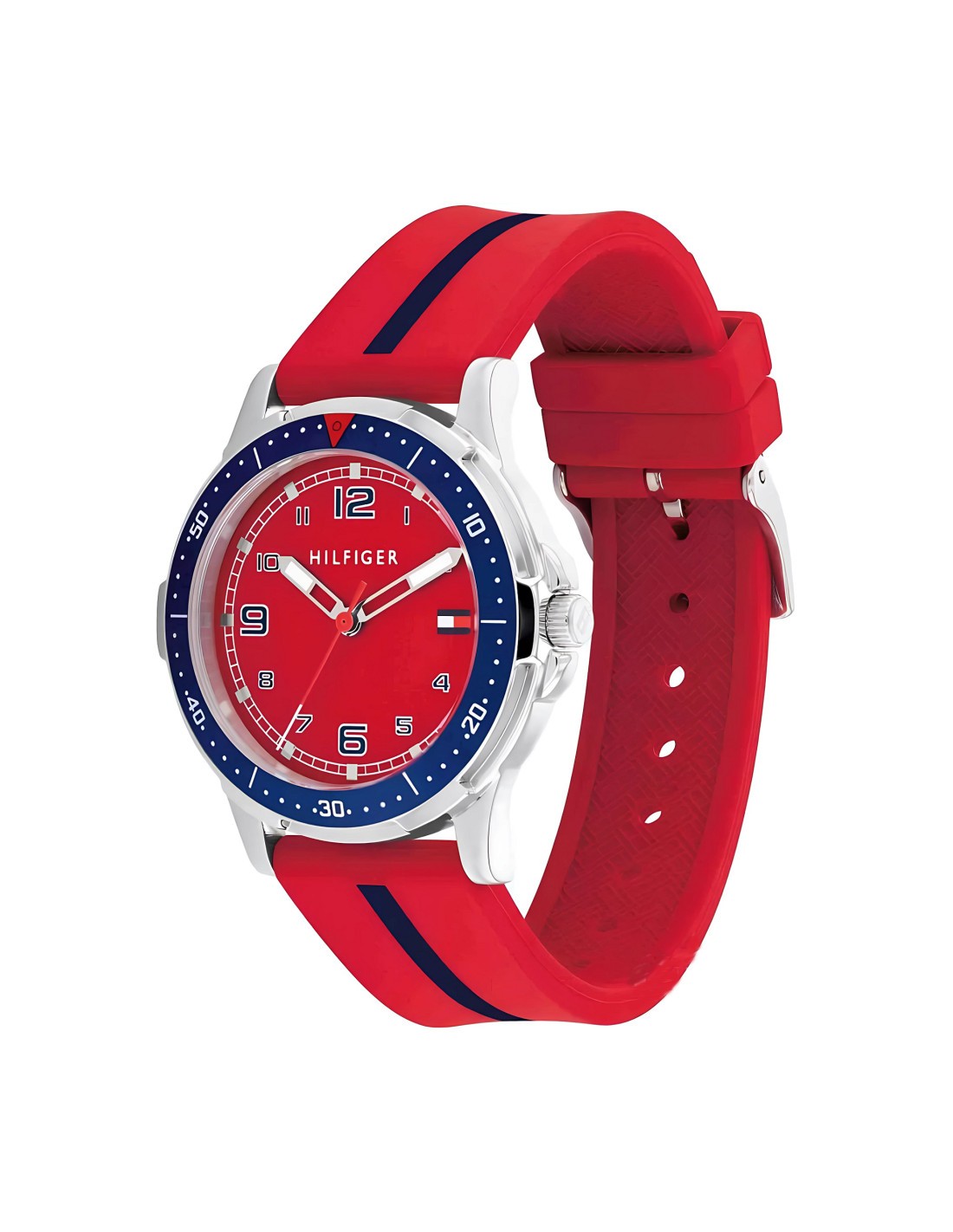 La caja del reloj tiene un diámetro de 34 mm aproximadamente. Cristal mineral y movimiento de cuarzo. La correa es de silicona color rojo con franja azul con cierre tipo hebilla. Tiene una resistencia al agua de 30m (3ATM). Cuenta con la garantía oficial Tommy Hilfiger de 24 meses. Se entrega con su caja oficial.
