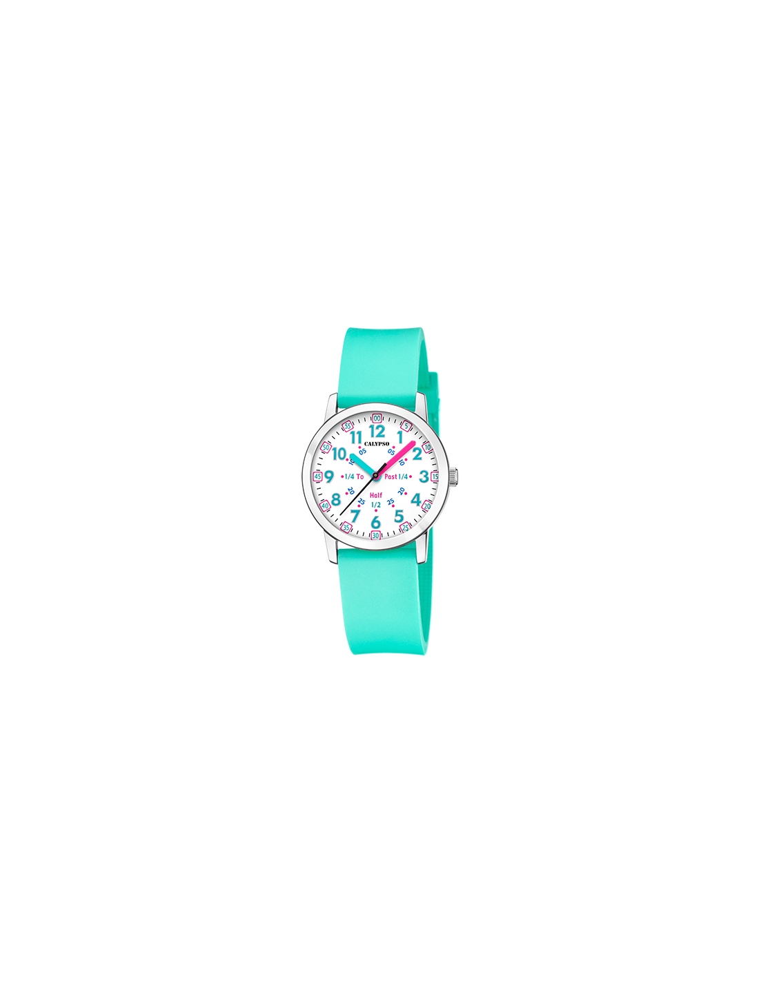 Se trata de un reloj analógico con caja redonda de acero. La caja del reloj tiene un diámetro de 30 mm aproximadamente. Cristal mineral. La correa es de caucho color verde agua con cierre tipo hebilla. Tiene una resistencia al agua de 50m (5ATM). Cuenta con la garantía oficial Calypso de 24 meses. Se entrega con su caja oficial.
