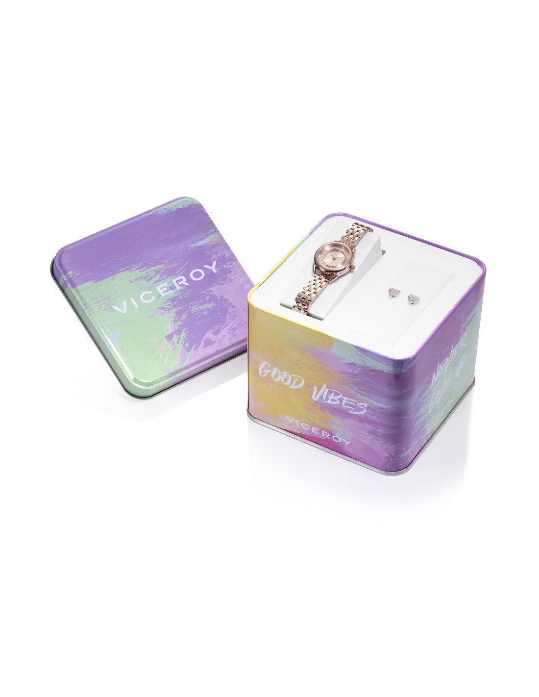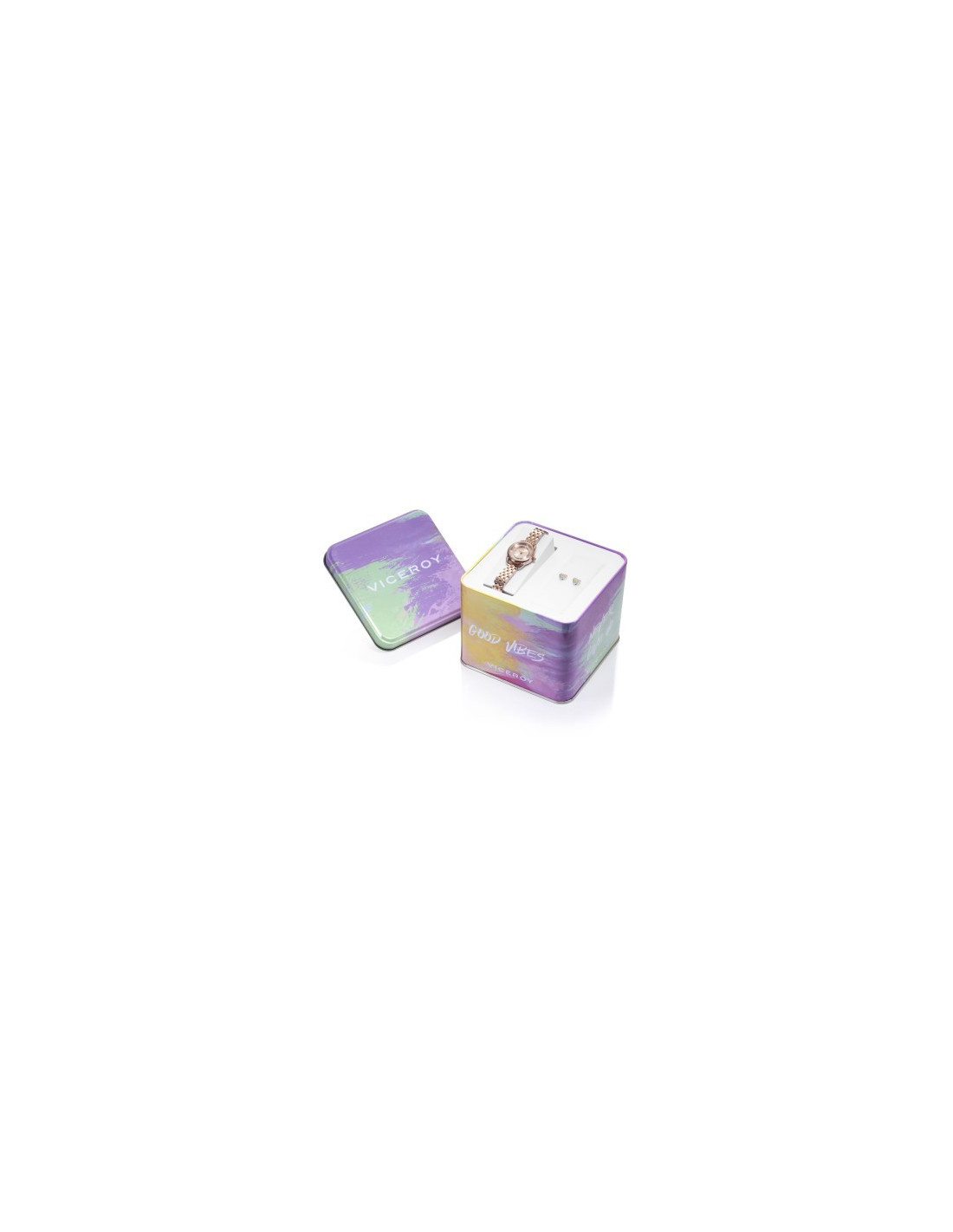 Se trata de un reloj analógico con caja redonda de acero inoxidable color rosado. La caja del reloj tiene un diámetro de 24 mm. Cristal mineral y movimiento de cuarzo. Pulsera de acero con cierre tipo desplegable. Tiene una resistencia al agua de 30 metros (3ATM). Cuenta con la garantía oficial Viceroy de 24 meses. Se entrega con su caja oficial.