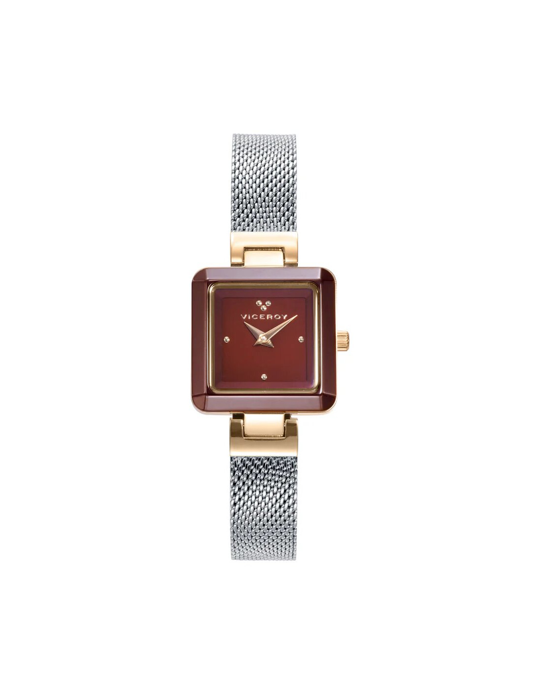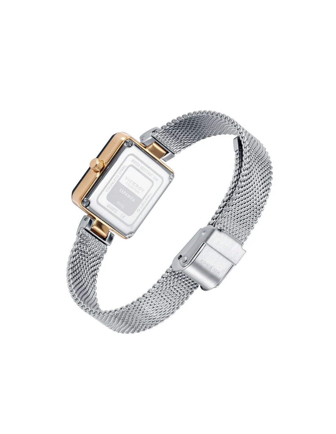 Se trata de un reloj analógico con caja cuadrada de acero inoxidable. La caja del reloj tiene un diámetro de 25x25 mm. Cristal mineral y movimiento de cuarzo. Malla de acero plateada con cierre tipo broche con cierre de seguridad. Tiene una resistencia al agua de 30 metros (3ATM). Cuenta con la garantía oficial Viceroy de 24 meses. Se entrega con su caja oficial.