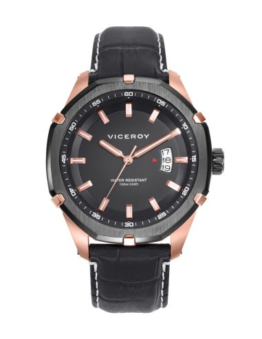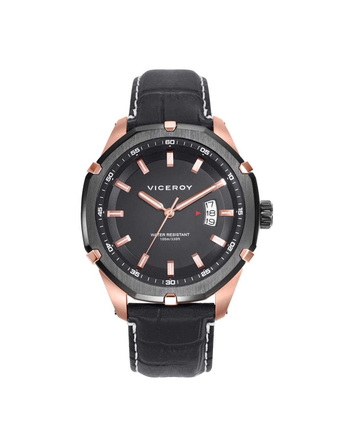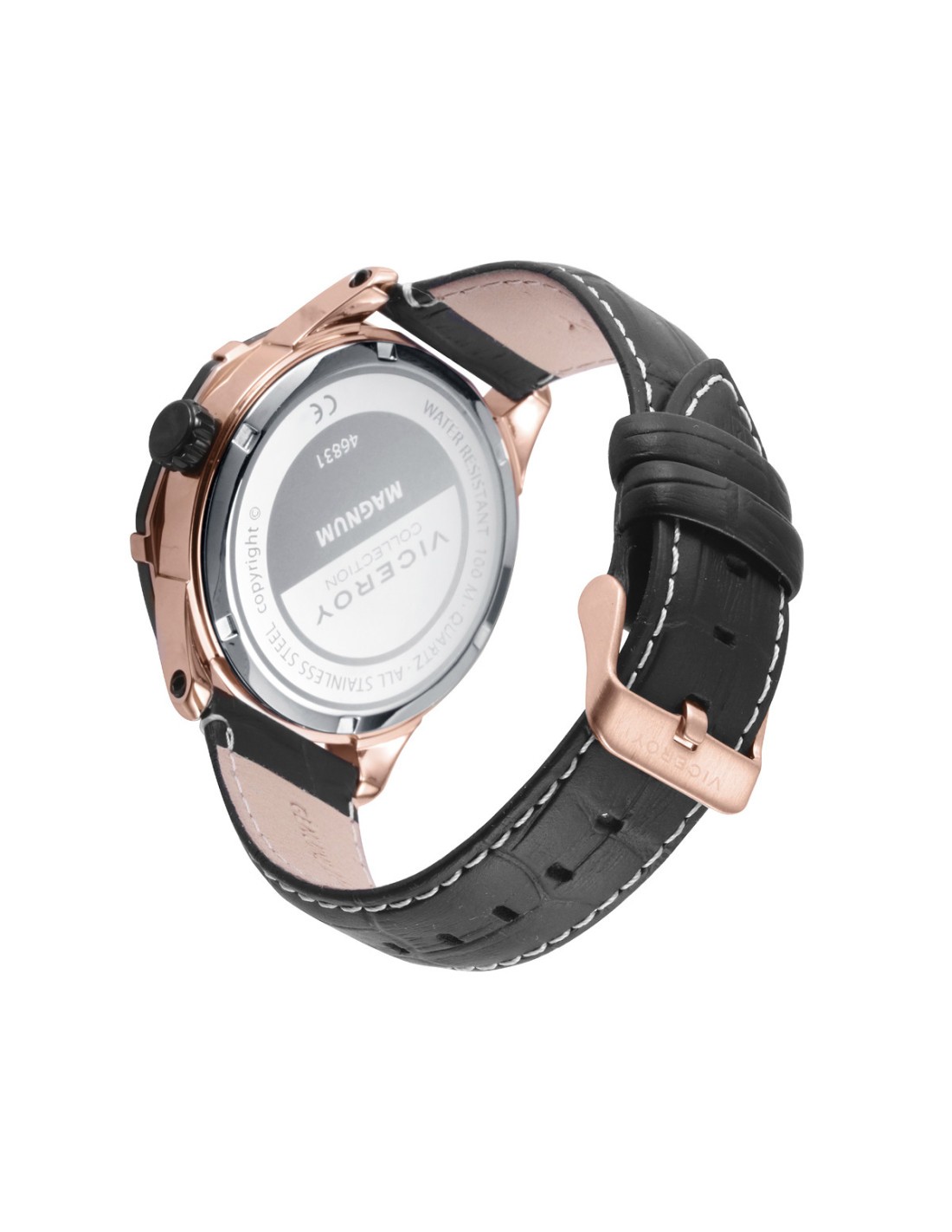 Reloj para hombre fabricado en acero ip rosado con correa de piel marca Viceroy colección Magnum. Se trata de un reloj analógico con caja redonda de acero inoxidable. La caja del reloj tiene un diámetro de 44,5 mm. Esfera color negro. Cristal mineral y movimiento de cuarzo. Correa de piel color negra con cierre tipo hebilla.