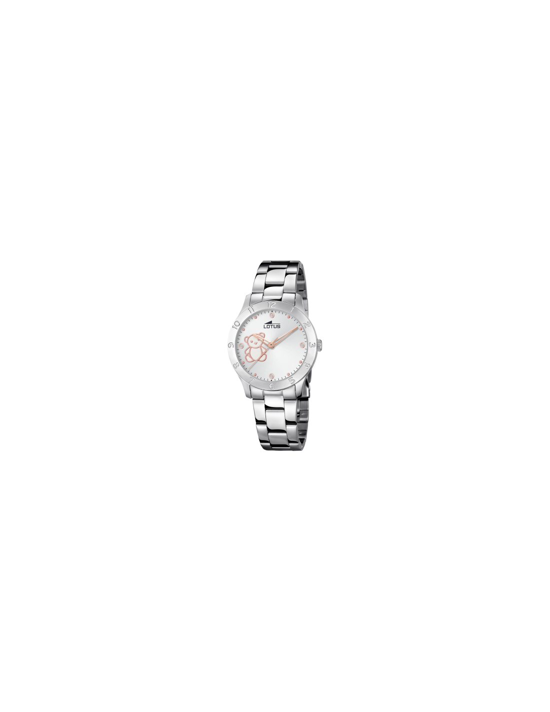 Se trata de un reloj analógico con caja redonda de acero inoxidable. La caja del reloj tiene un diámetro de 31 mm aproximadamente. Esfera con osito. Cristal mineral y movimiento de cuarzo. Pulsera de eslabones con cierre tipo broche. Tiene una resistencia al agua de 50 metros (5ATM). Cuenta con la garantía oficial Lotus de 24 meses. Se entrega con su caja oficial.