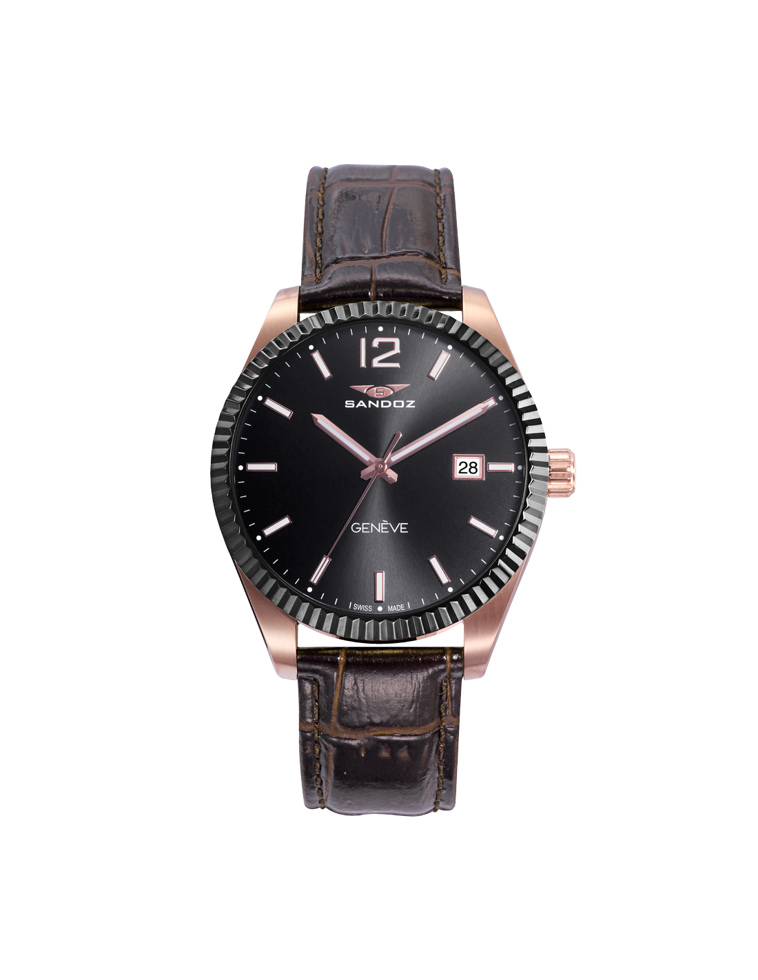 Reloj suizo para hombre fabricado en acero con correa de piel y cristal zafiro marca Sandoz colección Casuel. Se trata de un reloj suizo analógico con caja redonda de acero inoxidable.