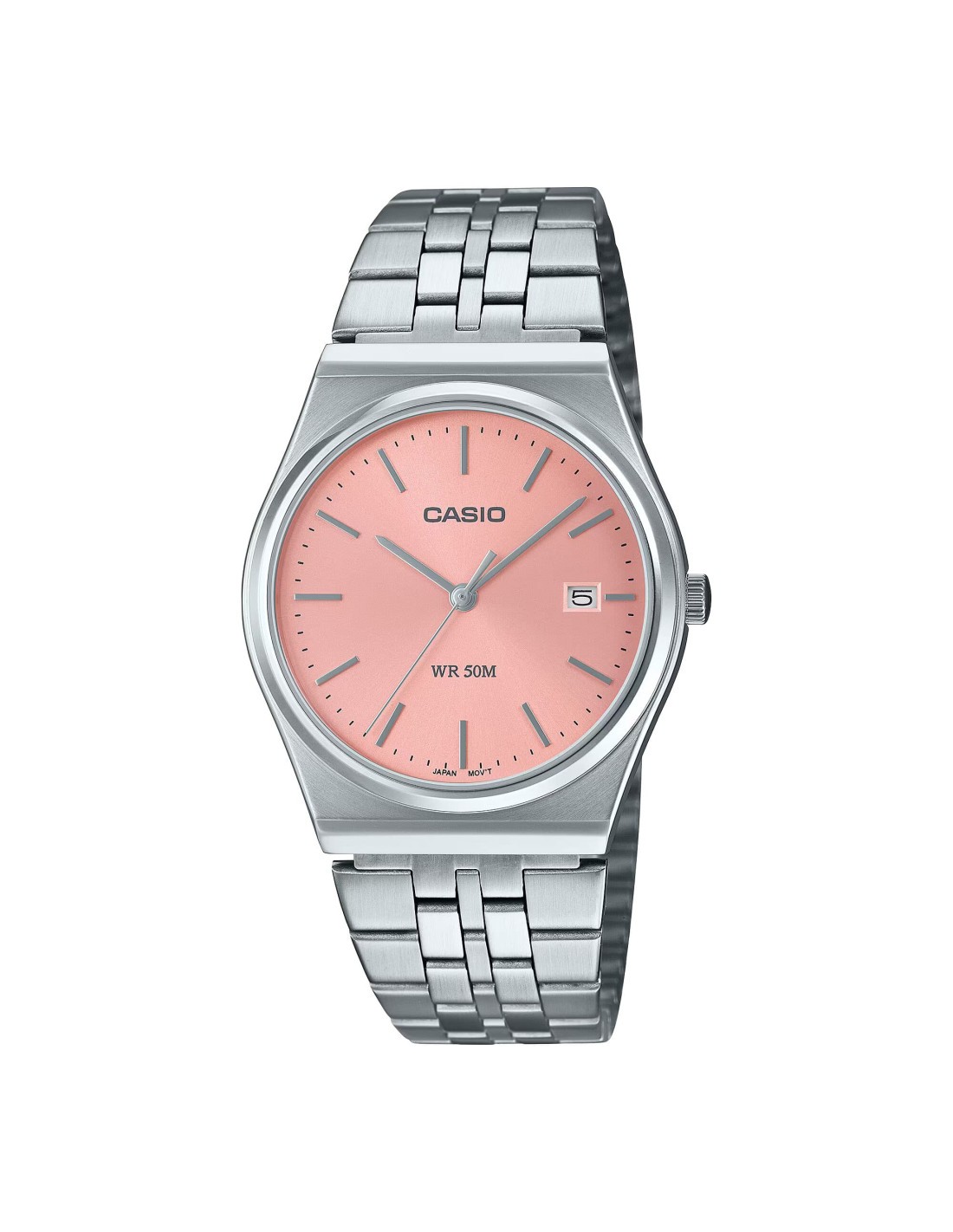 La caja del reloj tiene un diámetro de 35 mm aproximadamente. Cristal mineral, esfera color rosa con movimiento de cuarzo con calendario. Pulsera de acero color plateado con cierre tipo broche desplegable. Es resistente al agua 50m y cuenta con la garantía oficial Casio de 36 meses. Se entrega con su caja oficial.