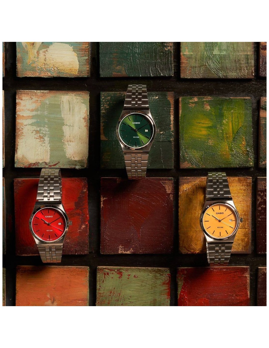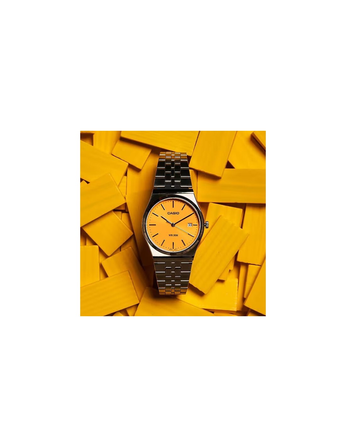 La caja del reloj tiene un diámetro de 35 mm aproximadamente. Cristal mineral, esfera color amarillo con movimiento de cuarzo con calendario. Pulsera de acero color plateado con cierre tipo broche desplegable. Es resistente al agua 50m y cuenta con la garantía oficial Casio de 36 meses. Se entrega con su caja oficial.
