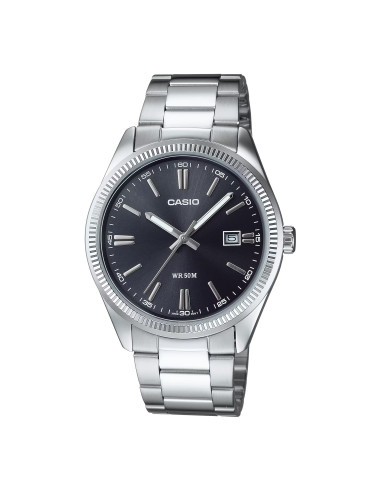 La caja del reloj tiene un diámetro de 38 mm aproximadamente. Cristal mineral, esfera color negro con movimiento de cuarzo con calendario. Pulsera de acero color plateado con cierre tipo broche desplegable. Es resistente al agua 50m y cuenta con la garantía oficial Casio de 36 meses. Se entrega con su caja oficial.