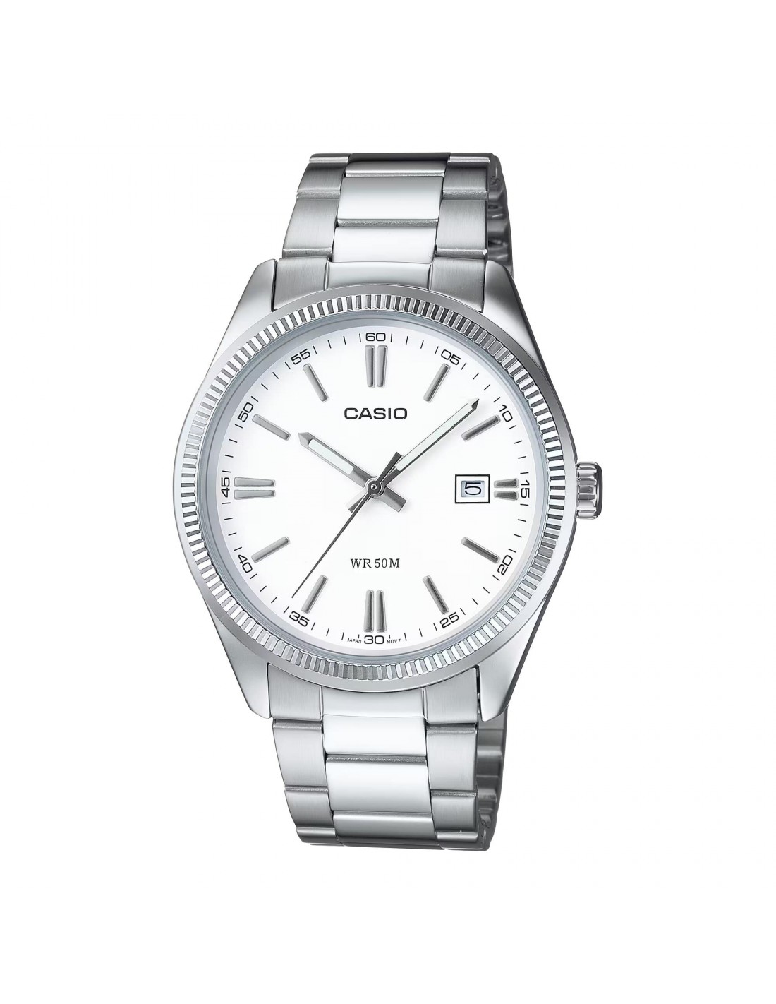 La caja del reloj tiene un diámetro de 38 mm aproximadamente. Cristal mineral, esfera color blanco y movimiento de cuarzo con calendario. Pulsera de acero color plateado con cierre tipo broche desplegable. Es resistente al agua 50m y cuenta con la garantía oficial Casio de 36 meses. Se entrega con su caja oficial.