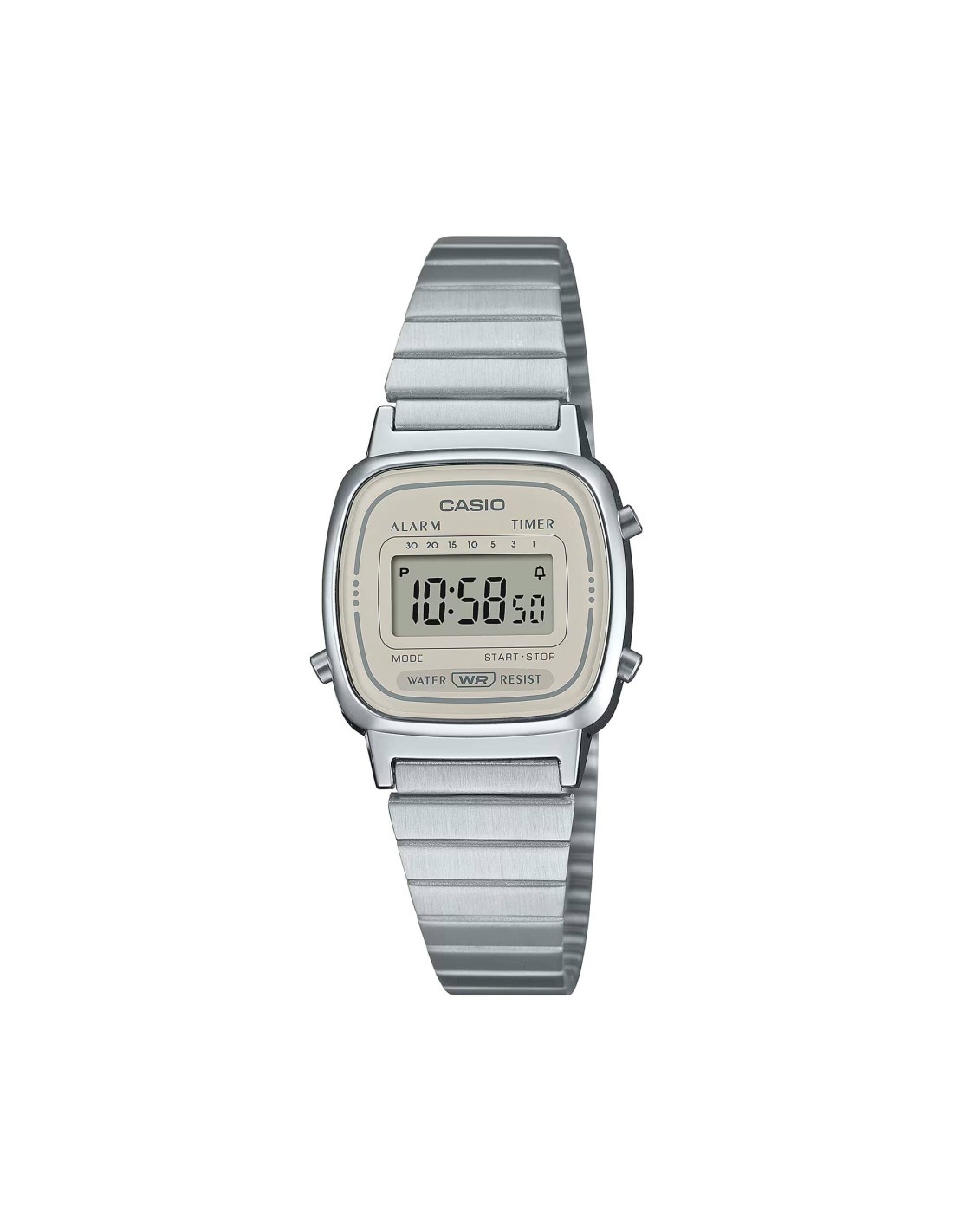 La caja del reloj tiene un diámetro de 24 mm aproximadamente. Cristal acrílico, esfera color marfil y movimiento de cuarzo. Pulsera de acero color plateado con cierre tipo broche. Entre sus funciones destacan el cronómetro, alarma, y temporizador. Es resistente al agua y cuenta con la garantía oficial Casio de 36 meses. Se entrega con su caja oficial.