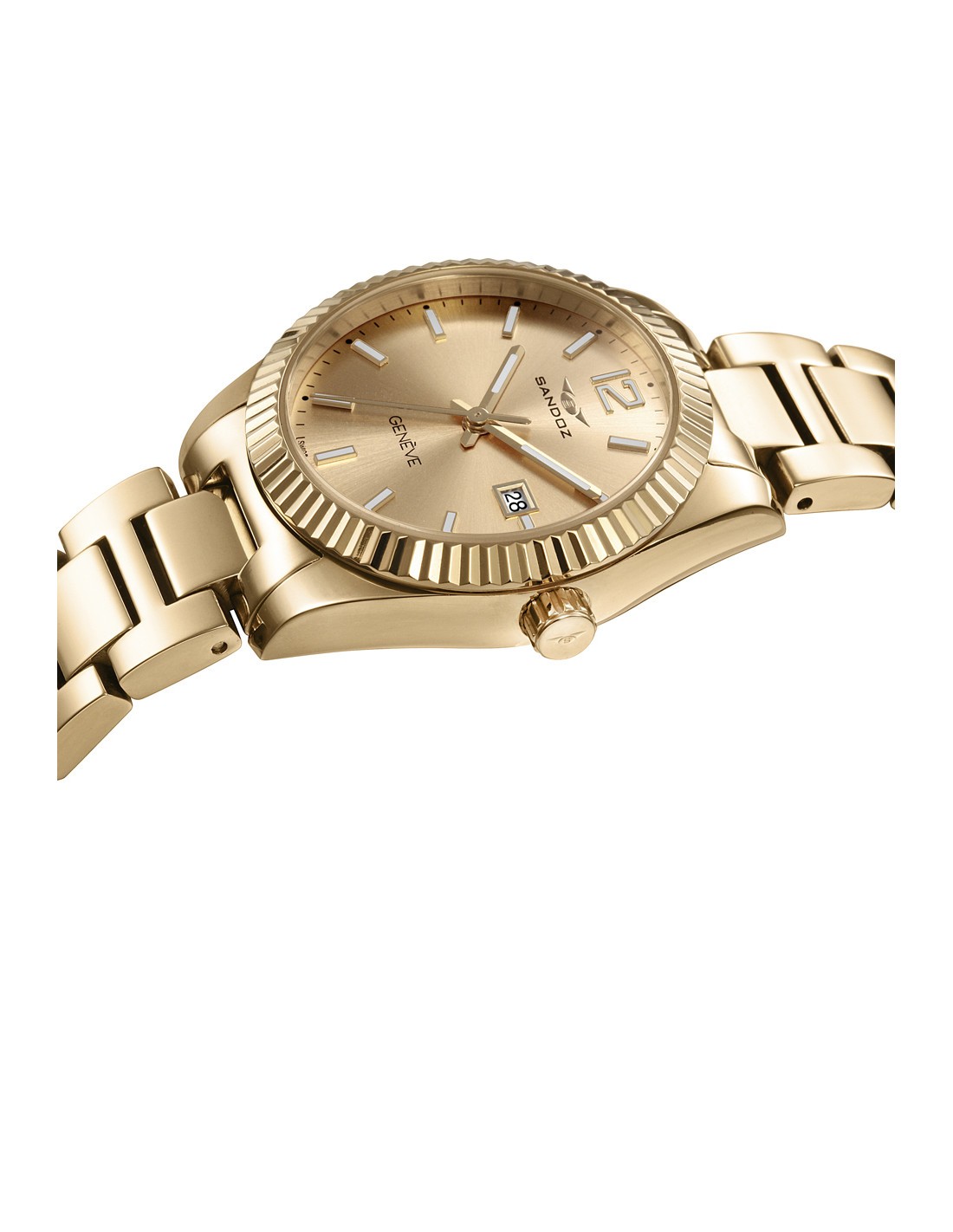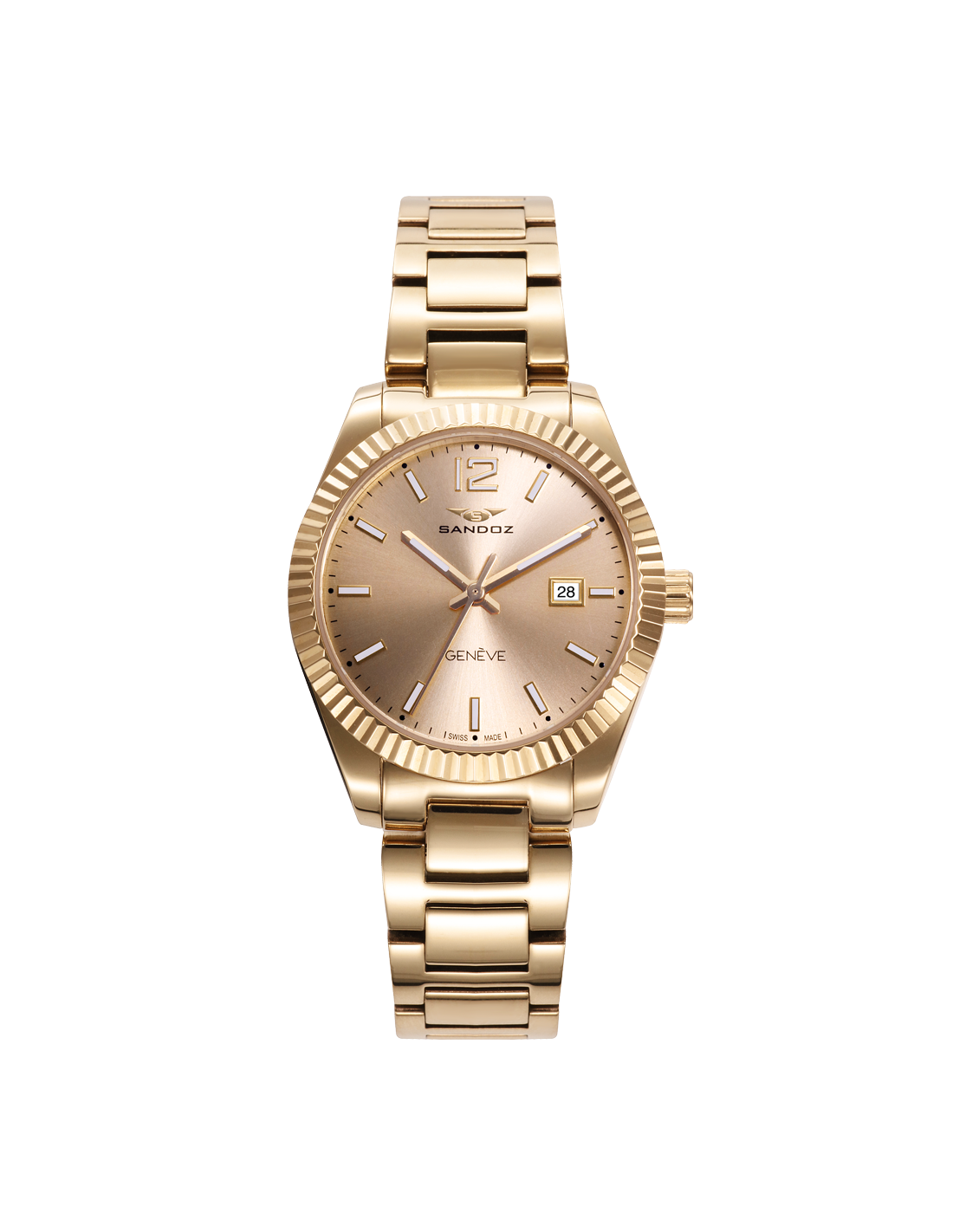 Reloj para mujer fabricado en acero marca Sandoz colección Casuel. Se trata de un reloj suizo analógico con caja redonda de acero inoxidable ip dorado.