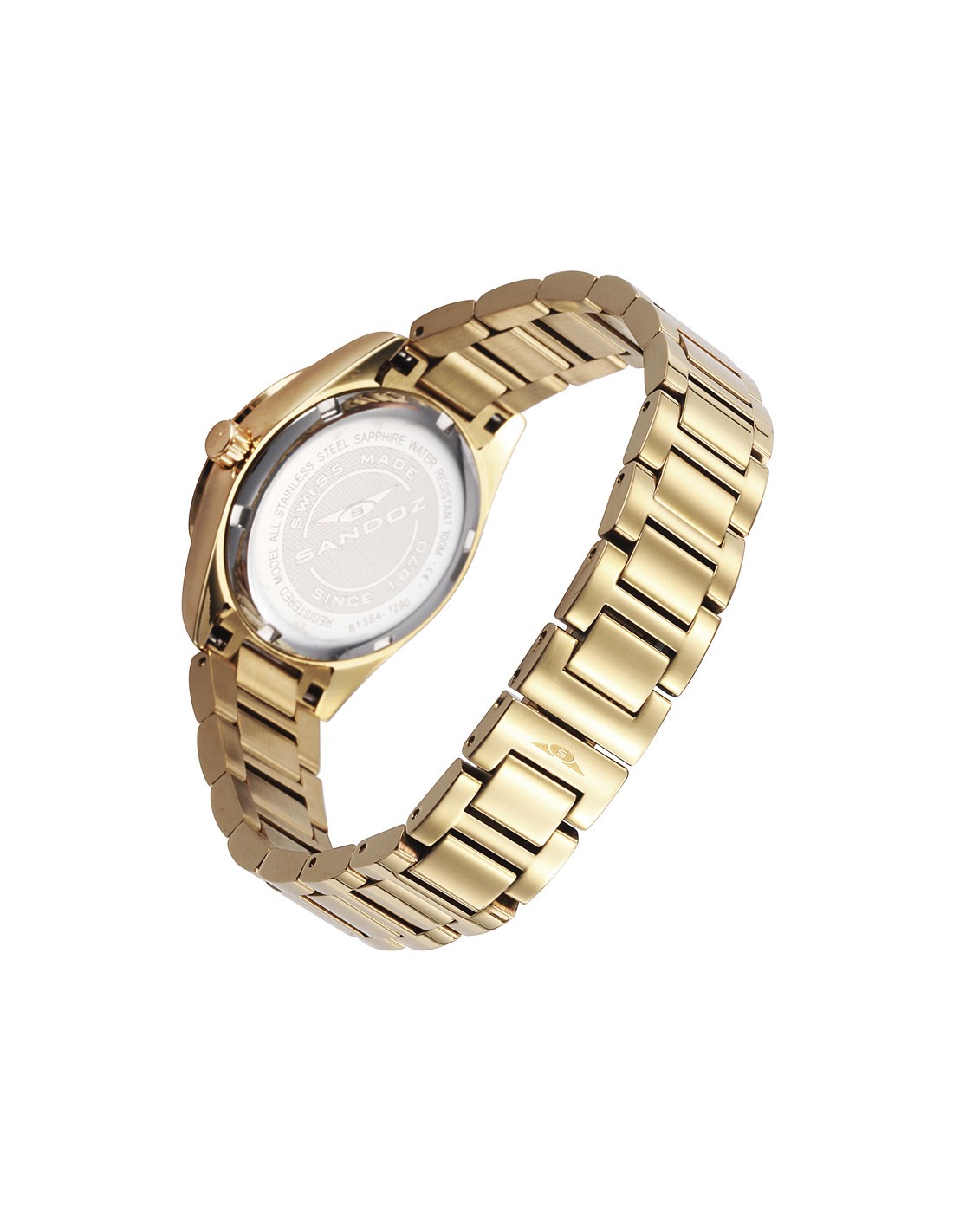 La caja del reloj tiene un diámetro de 32 mm aproximadamente. Esfera y bisel dorado. Cristal zafiro y movimiento de cuarzo. Pulsera de acero color dorado con cierre tipo broche. Tiene una resistencia al agua de 100 metros (10ATM). Cuenta con la garantía oficial Sandoz de 24 meses. Se entrega con su caja oficial.
