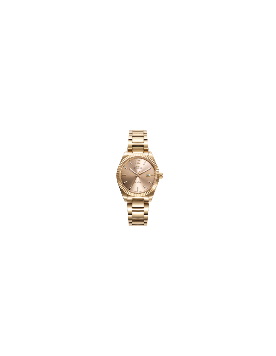 Fabricado en acero inoxidable ip dorado con cristal zafiro y pulsera de eslabones. Resistencia al agua 100 metros.